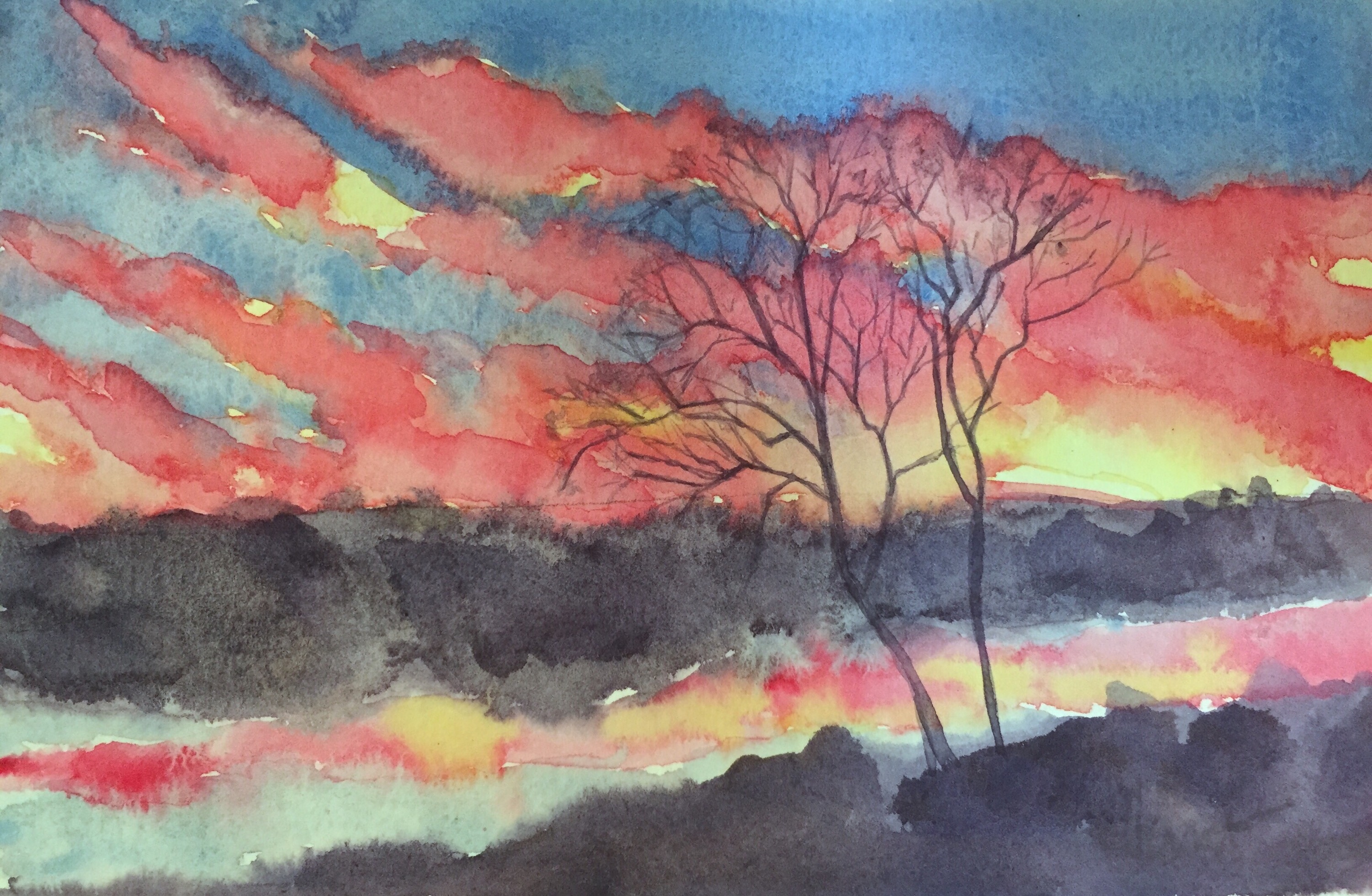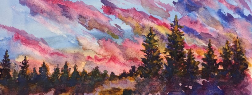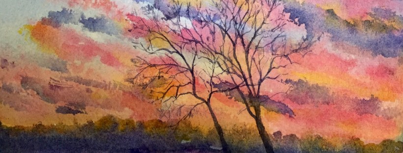 Tonites sunset. Aglow with pinks and touches of yellow. I laid down lines of Quinacridone red and aureolin yellow. Then I filled I with cobalt and cerulean. The treeline is cobalt violet and ultramarine blue with a touch of burnt umber. Trees painted with the same paint.