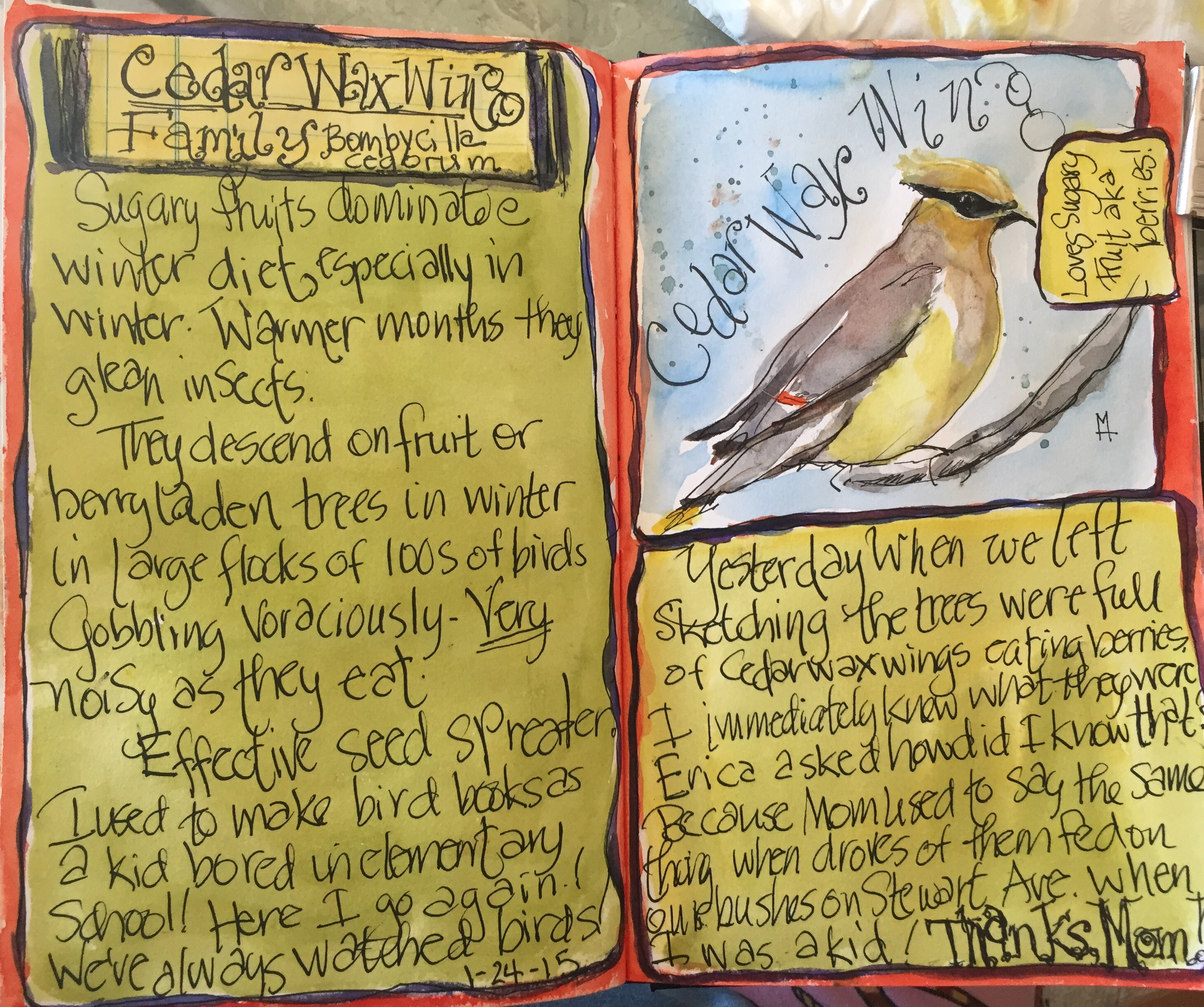 I also looked them up to write the left hand page. Then I remembered sitting in class in third and fourth grade entertaining myself making bird books from some little bird guides someone had given me. Those involved notebook paper and pencil sketches. I guess I have come full circle!!