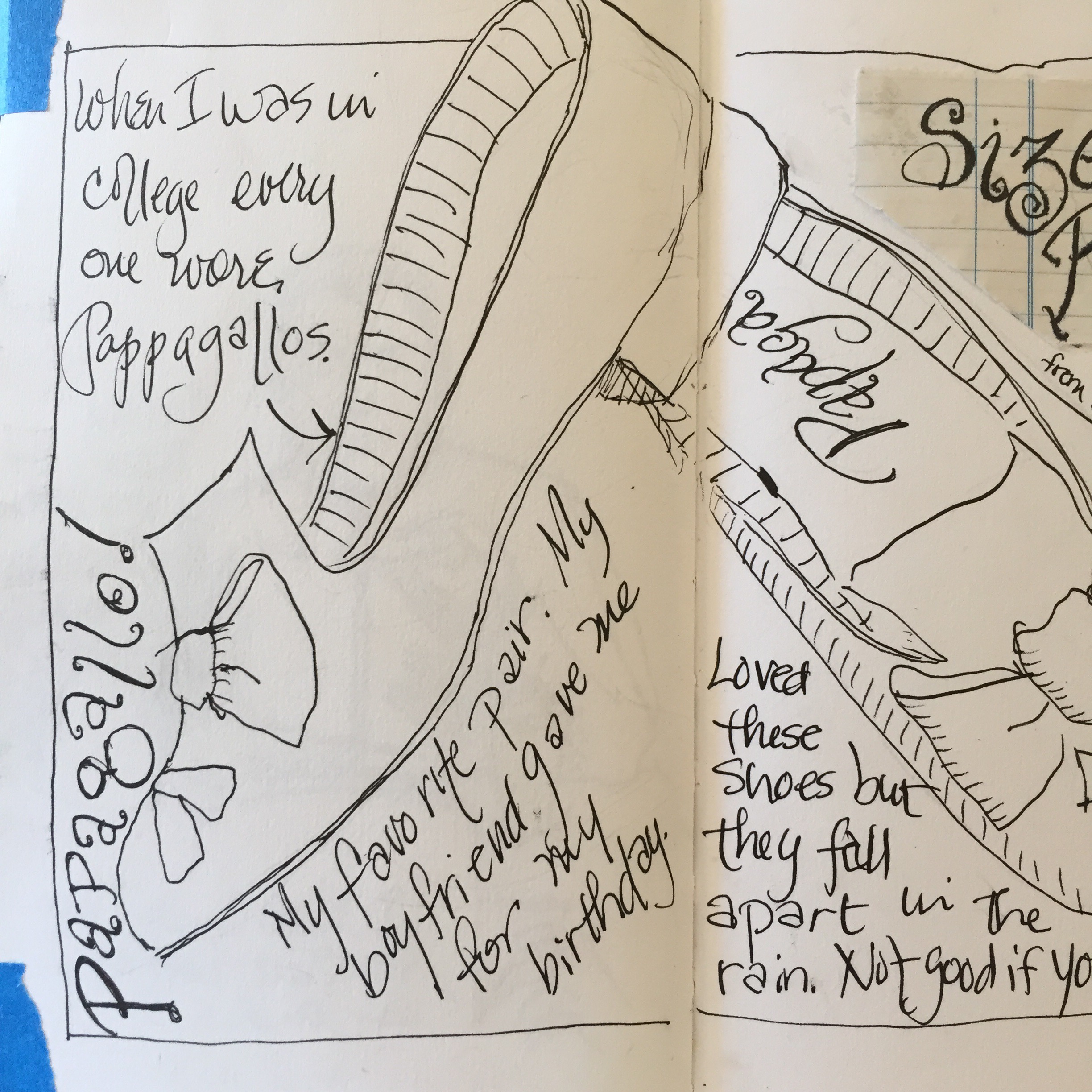 One of my friends Carolyn Cates drew her shoes. I decided to draw my favorite Pappagallos. I loved these shoes. Expensive for a student but not meant for walking the campus in all weather. They were notorious for falling apart in a sudden rain shower.