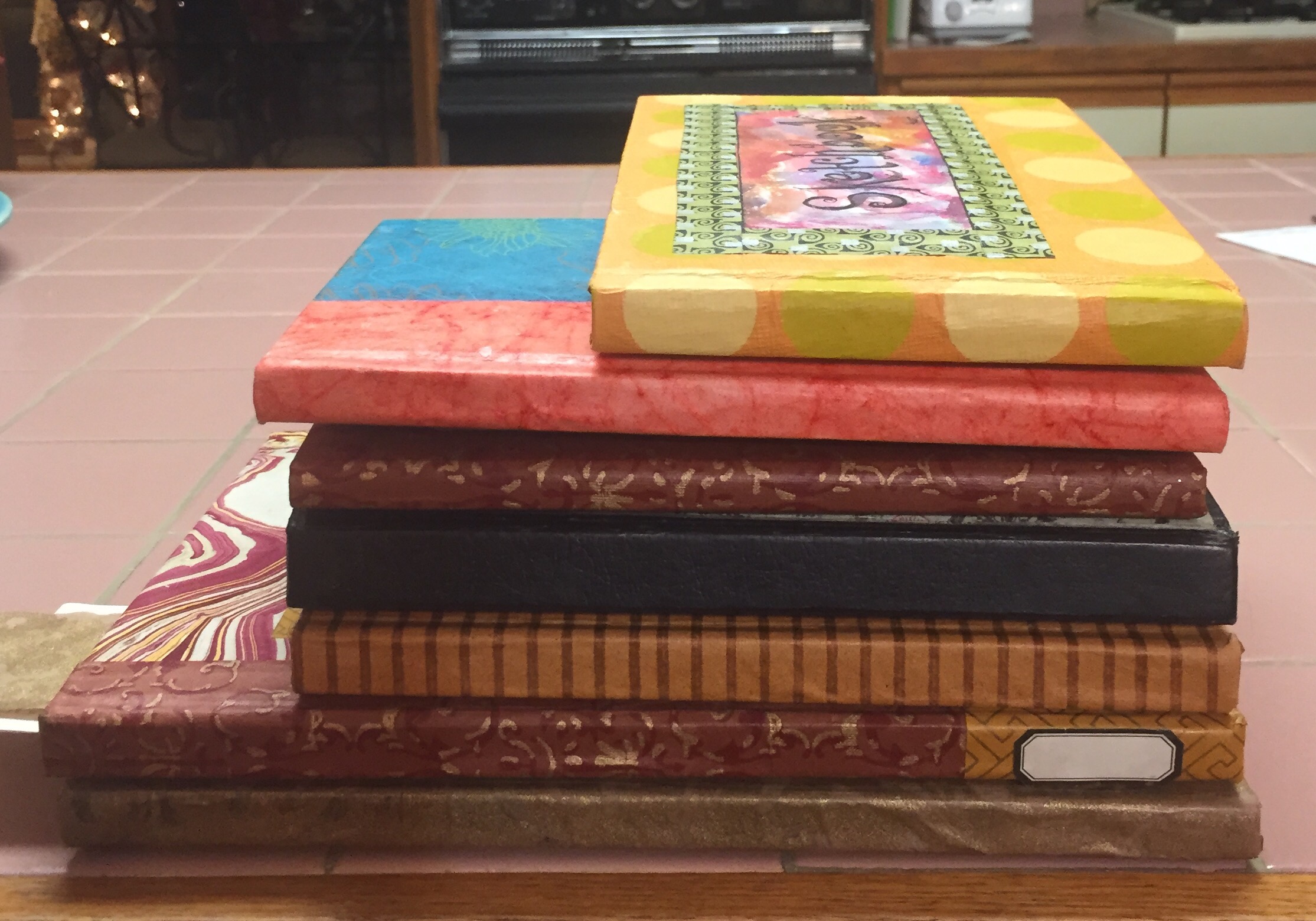 I think they will look a lot better in the shelf than the old brown and black covers like the old one in the stack that’s still not covered. It does have stickers all over it. If that counts?!