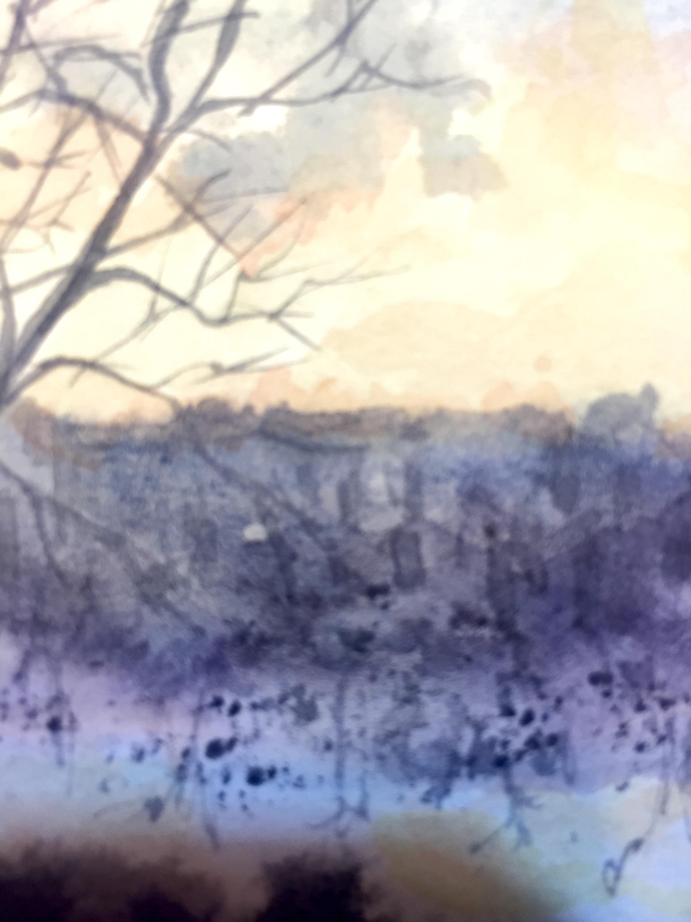 The trees are done with my wonderful Isabey #2 I bought at Utrecht dick Blick with my Christmas money. Love it. Long and a narrow tip. I have 1s and 0s that are bigger. I smeared some of the branches to make them look fuller. Twiggier.