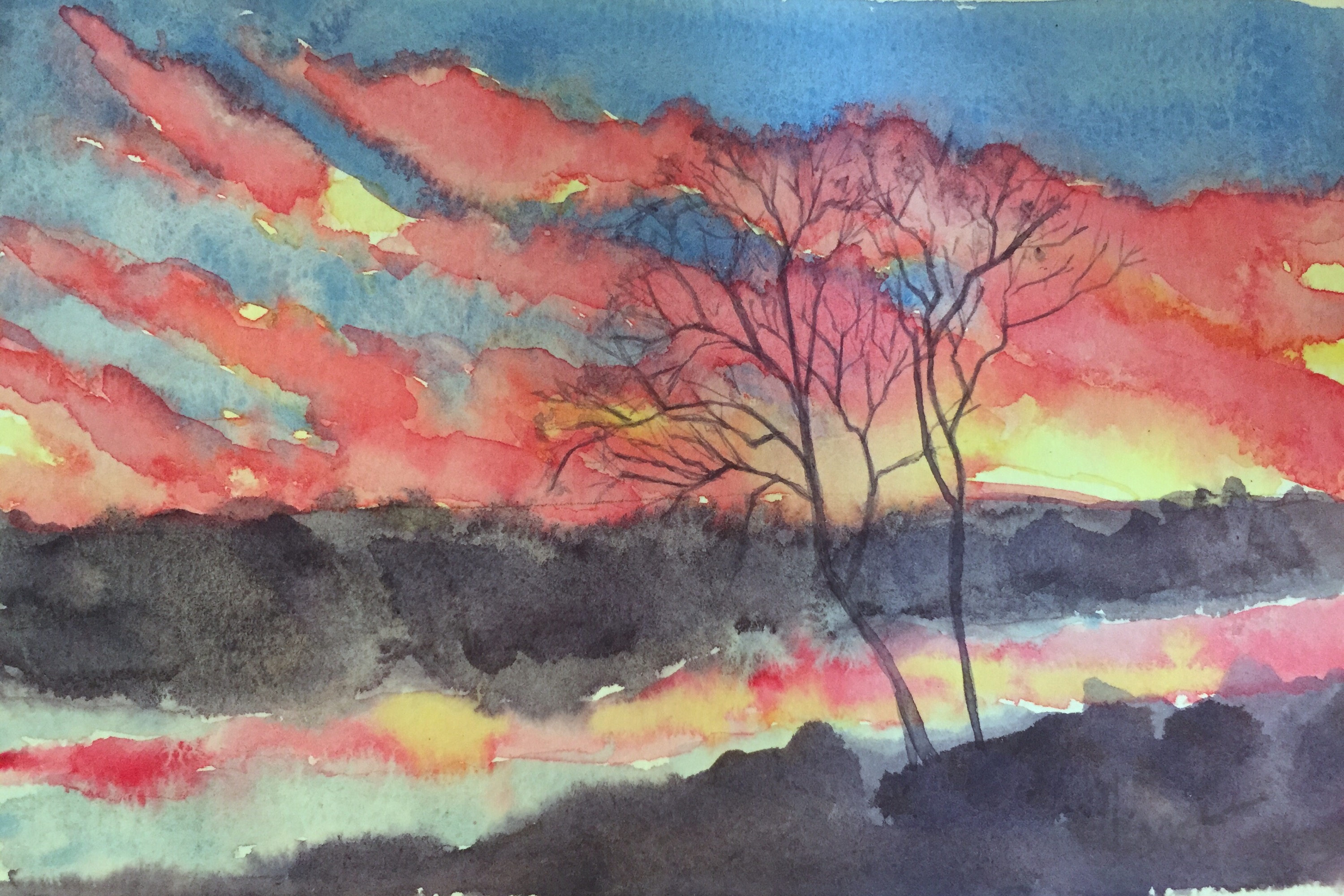Tonites sunset. Aglow with pinks and touches of yellow. I laid down lines of Quinacridone red and aureolin yellow. Then I filled I with cobalt and cerulean. The treeline is cobalt violet and ultramarine blue with a touch of burnt umber. Trees painted with the same paint.