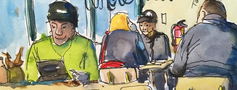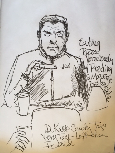 This guy fascinated me. Everything about him was very square. His shoulders his head his forehead. And mile long fingers. Read a running magazine as he ravenously ate pizza. Drove a car with DeKalb Co tags. No wanted to ask him if he knew my kids but I restrained myself. You learn a lot about people when you sit and sketch them aka observe them.
