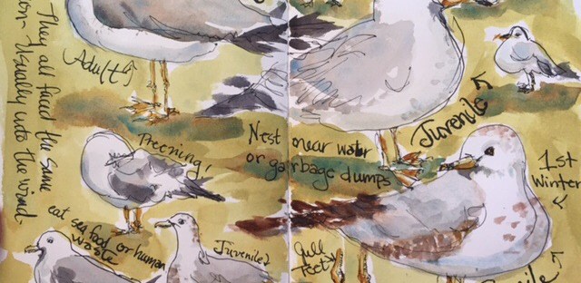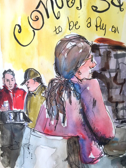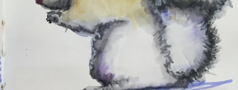 He was drawn with Tombow Markers. I have four or five of them and used the range of greys to shade and sculpt him. Then I wet him down to let the colors mix on the Strathmore 500 mixed Media Paper. I don’t know why I use the Tombows because according to Roz Stendahl they are not archival. The colors are fugitive. So sad because they are such fun to use and give such a neat effects when wet.