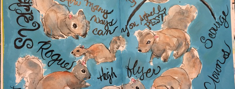 At times I get bored drawing the birds on the back porch and I draw the squirrels. Actually they are easier to draw than the birds because the hold still sometimes for quite a while. The squirrels are drawn with Noodler Lexington Gray ink and are painted with watercolor. A combo of Quin Sienna and cerulean. I don’t understand why the Lexington Graybis waterproof while the supposedly Bulletproof black and the eelskin so not. So strange.
