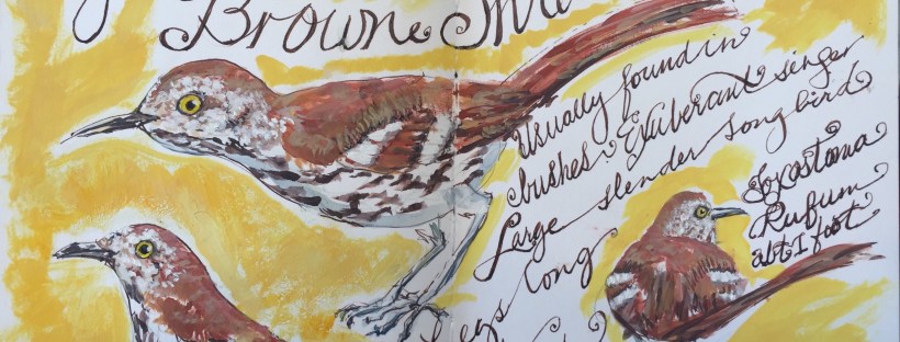 i had three other things I meant to be working on today instead I drew more birds?! I have had a touch of bronchitis and was sitting on the den sofa feeling bad. I glanced out the window to see a huge brown bird on the back deck. He was at least five times as big as any bird out there. Thrashers are ground dwellers and I had only seen one once before on the deck though I see them in the yard a lot.