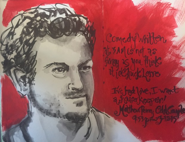 I must be feeling better because last nite I decided to draw Matthew Perry with his scruffy beard last night a la Roz Stendahl who posted guys with beards lol last week on her blog. I took a pic of him on his show Odd Couple. And that was it.