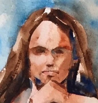 Step 1 – coral and yellow ochre over the face and upper torso. Then I added burnt sienna and cerulean in the shadows. I dipped the brush in water and shook the it out. Then I dipped it in the color I was using. I usually applied burnt sienna first trying not to leave hard edges.