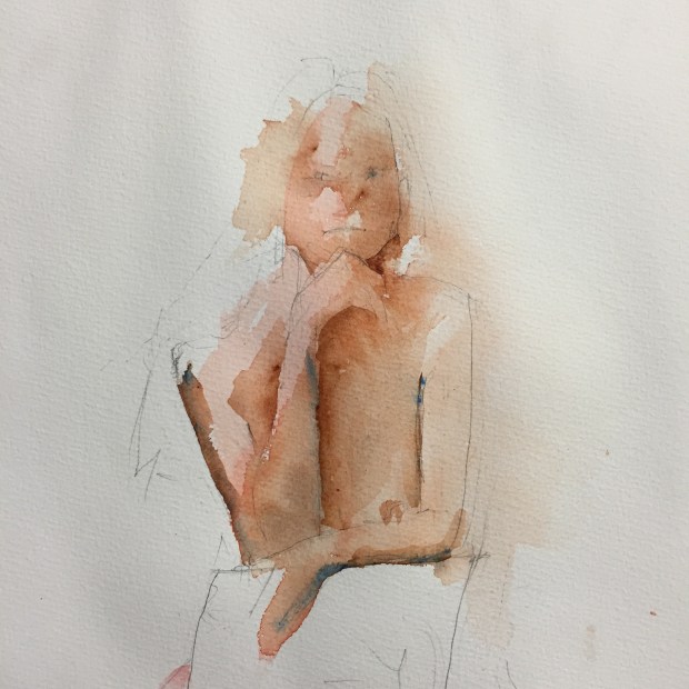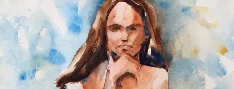 Step 1 – coral and yellow ochre over the face and upper torso. Then I added burnt sienna and cerulean in the shadows. I dipped the brush in water and shook the it out. Then I dipped it in the color I was using. I usually applied burnt sienna first trying not to leave hard edges.
