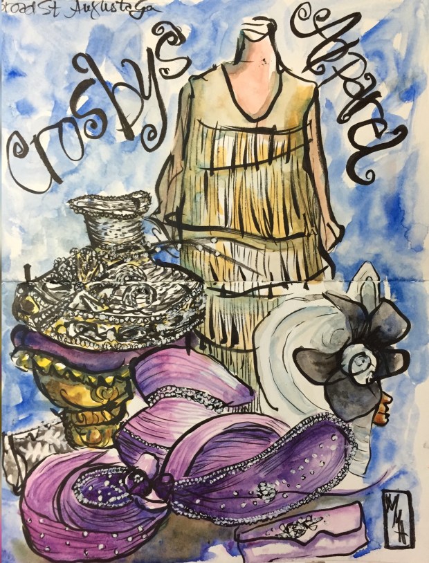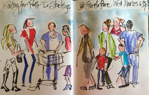 Groups of ladies walked by bound for Crosbys all in a twitters giggly bunch. Paused in front of the purple hat phong and aging before going into shop for their special Easter bonnet. I really enjoyed evesdropping on them. They were so enthralled in their conquests. The things you learn when you go sketching.