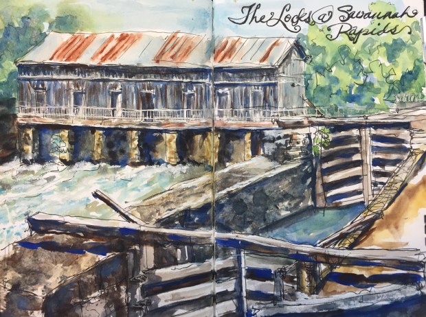 I drew the Locks at Savannah Rapida last Thursday when I was at the Savannah Rapids park for The Newcomers Lunch and a talk by the head of the Savannah River Keeper (http://www.savannahriverkeeper.org https://www.facebook.com/savannahriverkeeper) who does her best to keep the Savannah from being the most polluted river in the country instead of the fifth like it is now.