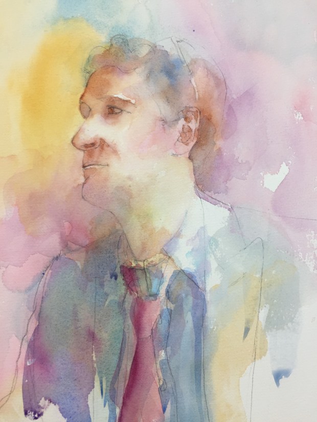 Layer 3 Adding more darks and color and trying to keep it soft but focused!! Still more to do but that’s all I have done as of now. Think I am find to lift some of the dark blue on his eye. The beard was done with a wash of cerulean. It was magic the way a beard just popped off the page!! Ultramarine blue and burnt umber In the hair. Keeping the edges soft.