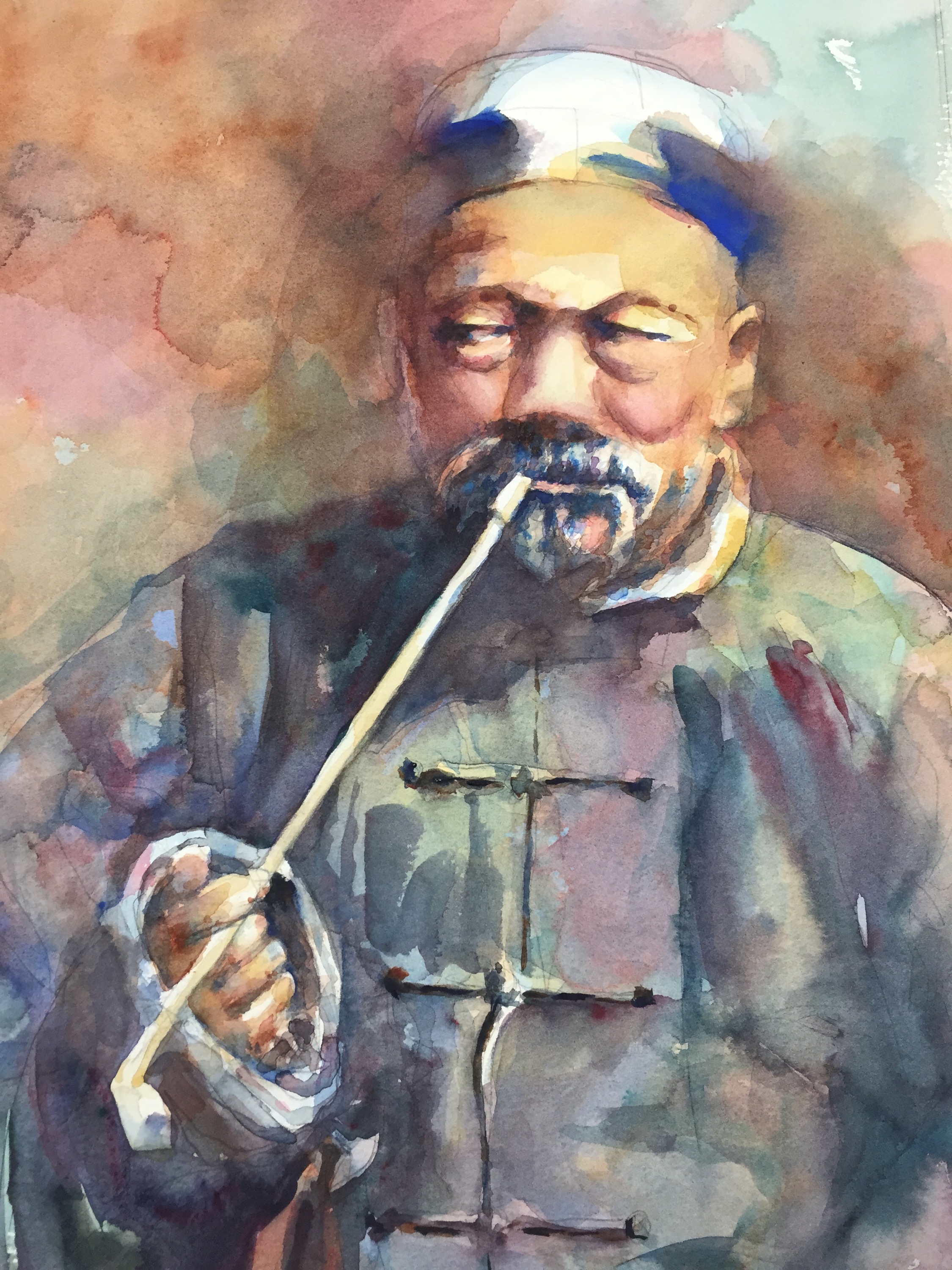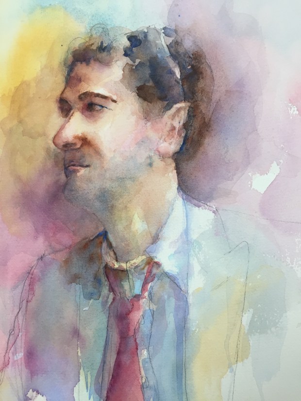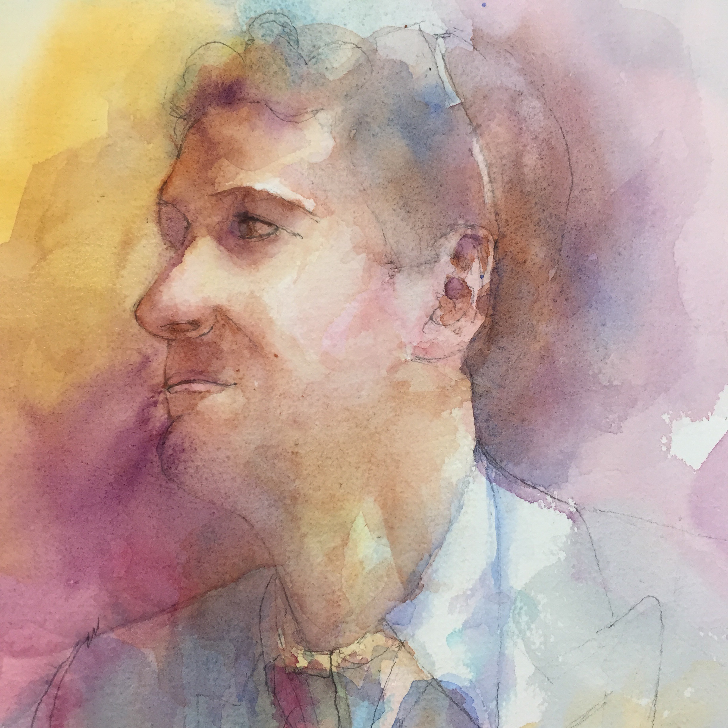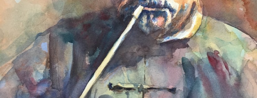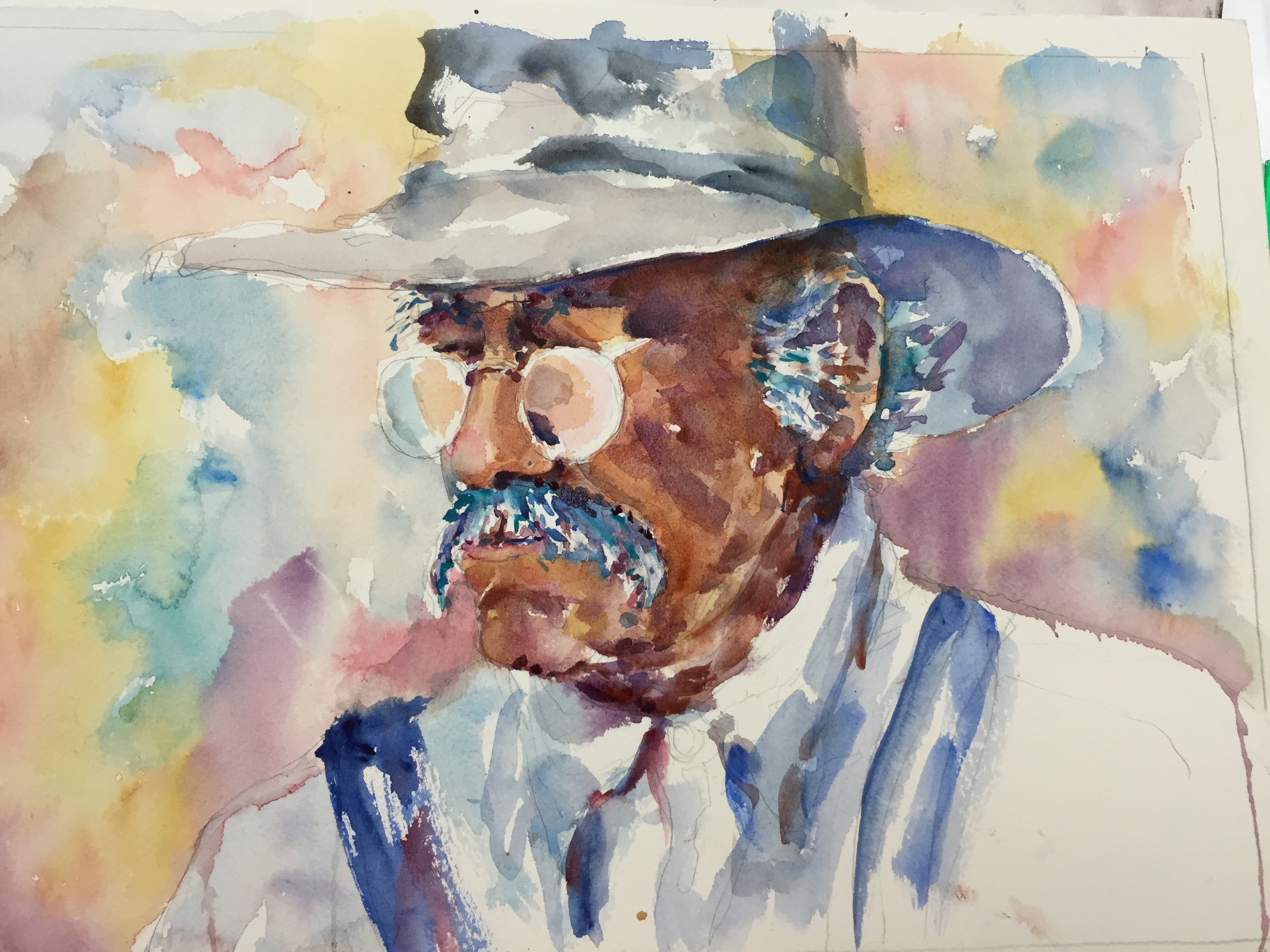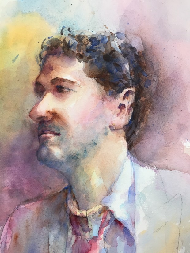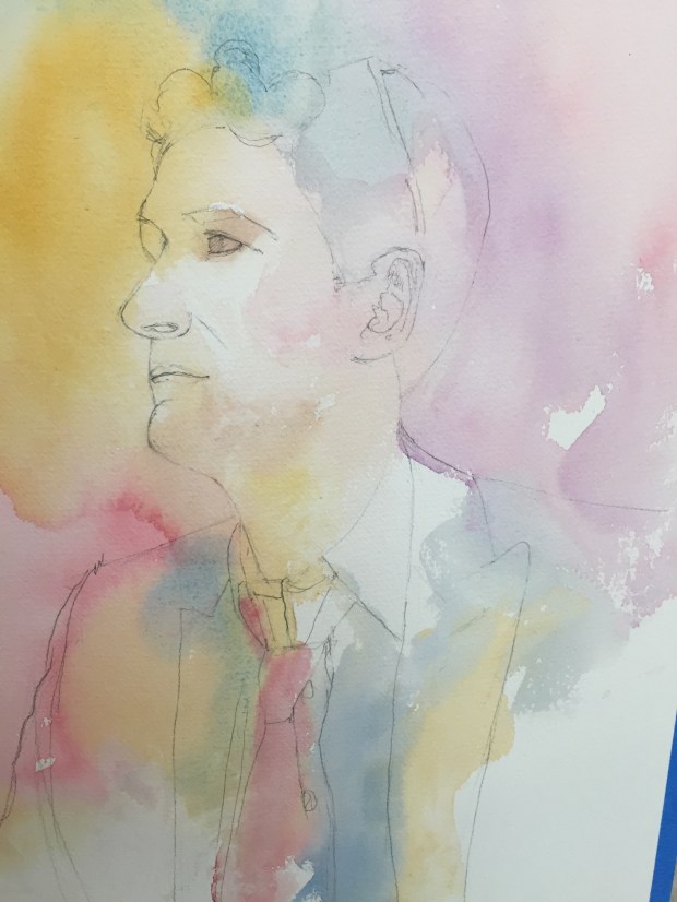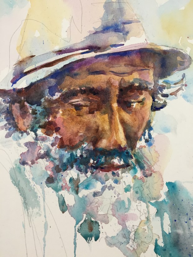 Layer 3 Adding more darks and color and trying to keep it soft but focused!! Still more to do but that’s all I have done as of now. Think I am find to lift some of the dark blue on his eye. The beard was done with a wash of cerulean. It was magic the way a beard just popped off the page!! Ultramarine blue and burnt umber In the hair. Keeping the edges soft.