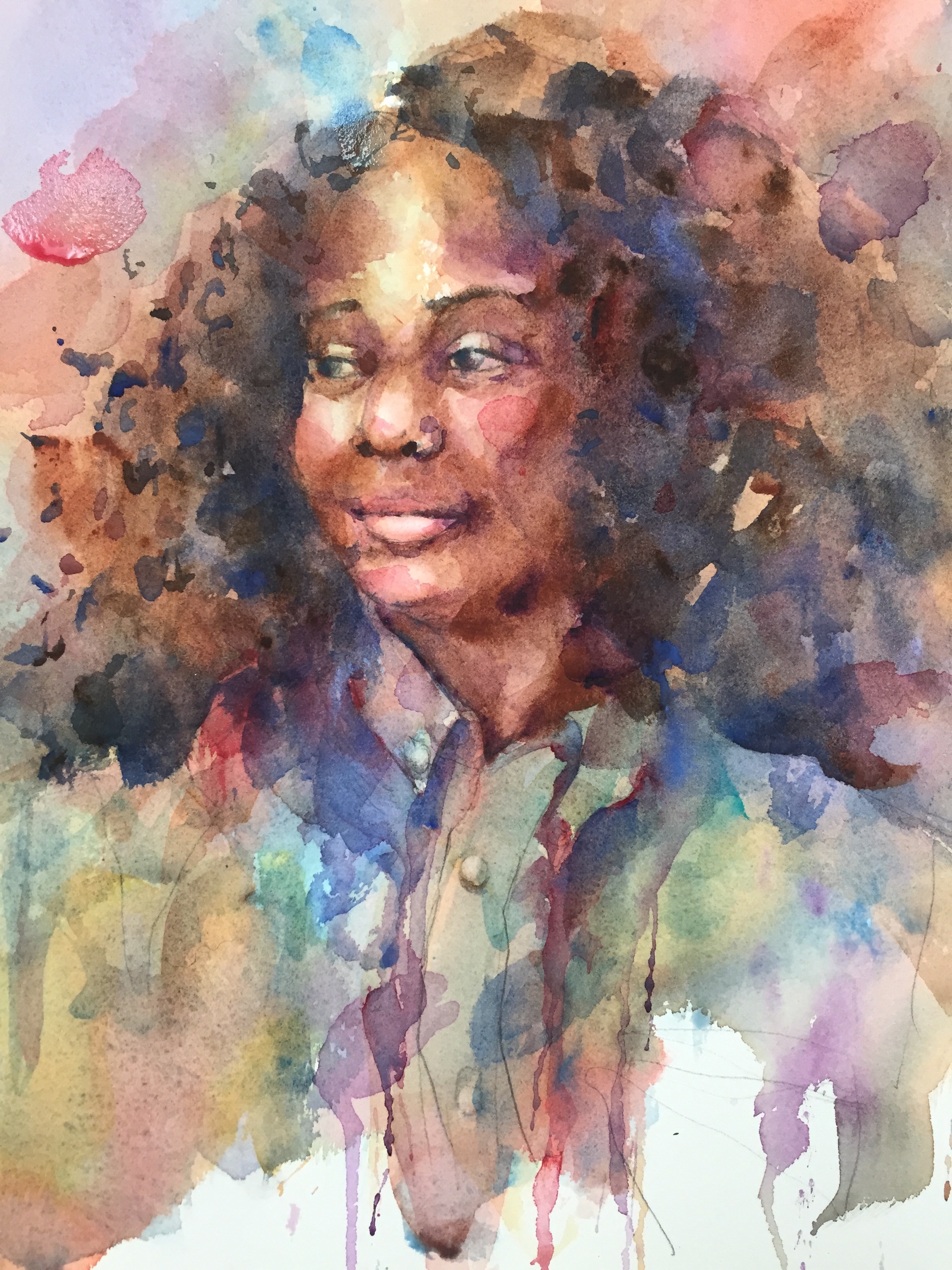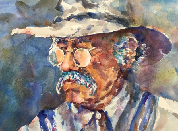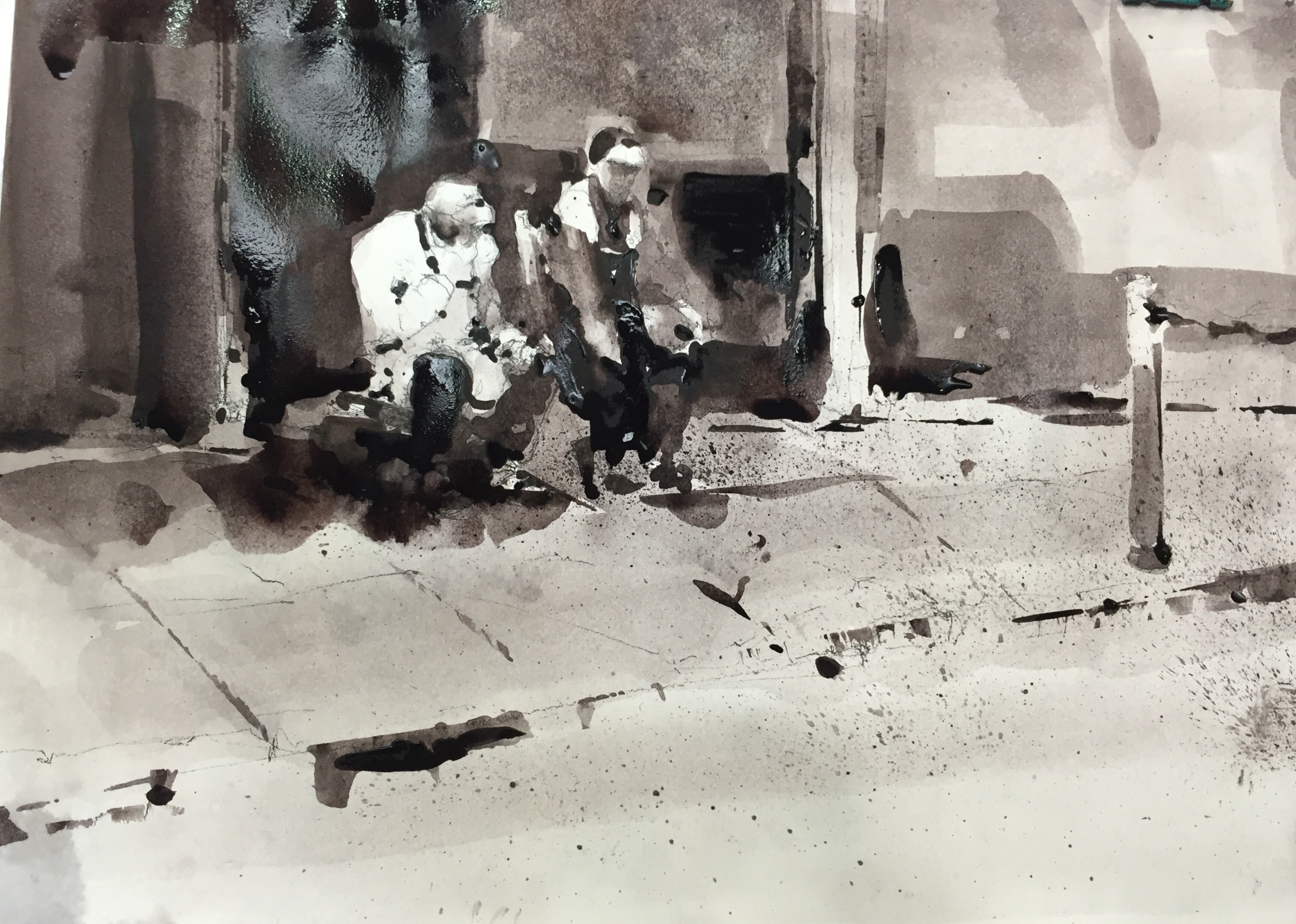 Black and white value study she did of two men in Chinatown. She doesn’t use pencil because it takes too long but instead uses Cheap Joes American Journey Warm Black and a big brush to whip it out.