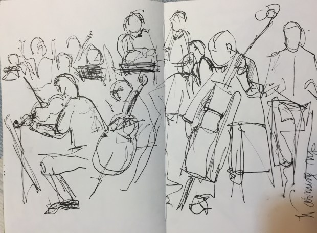 Last nite we went to the annual Pops under the Stars with the Augusta Symphony. I drew about thirty pages and half an accordion book. It was a lot of fun and felt like I really was in the groove. Pages of sketches of the conductor. They are so energetic. Just wish we were closer to see Maestro Z better.
