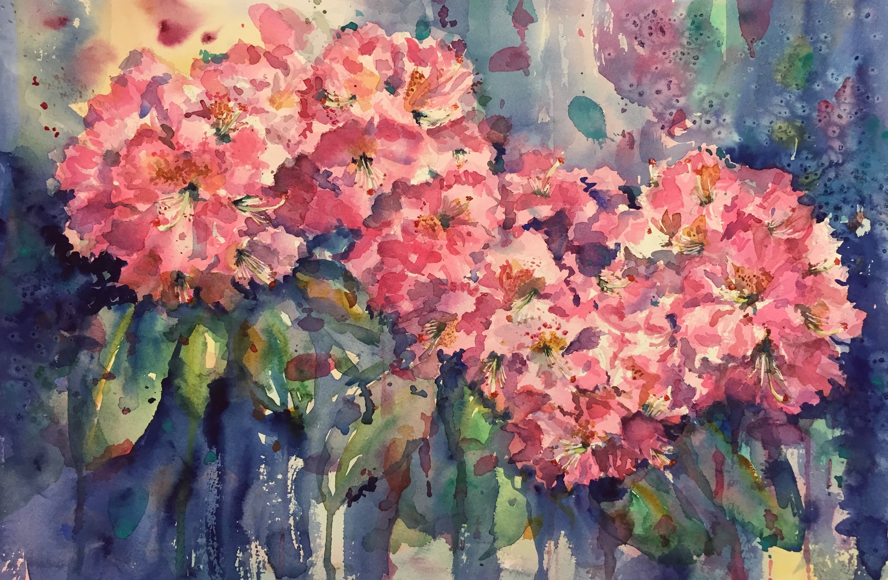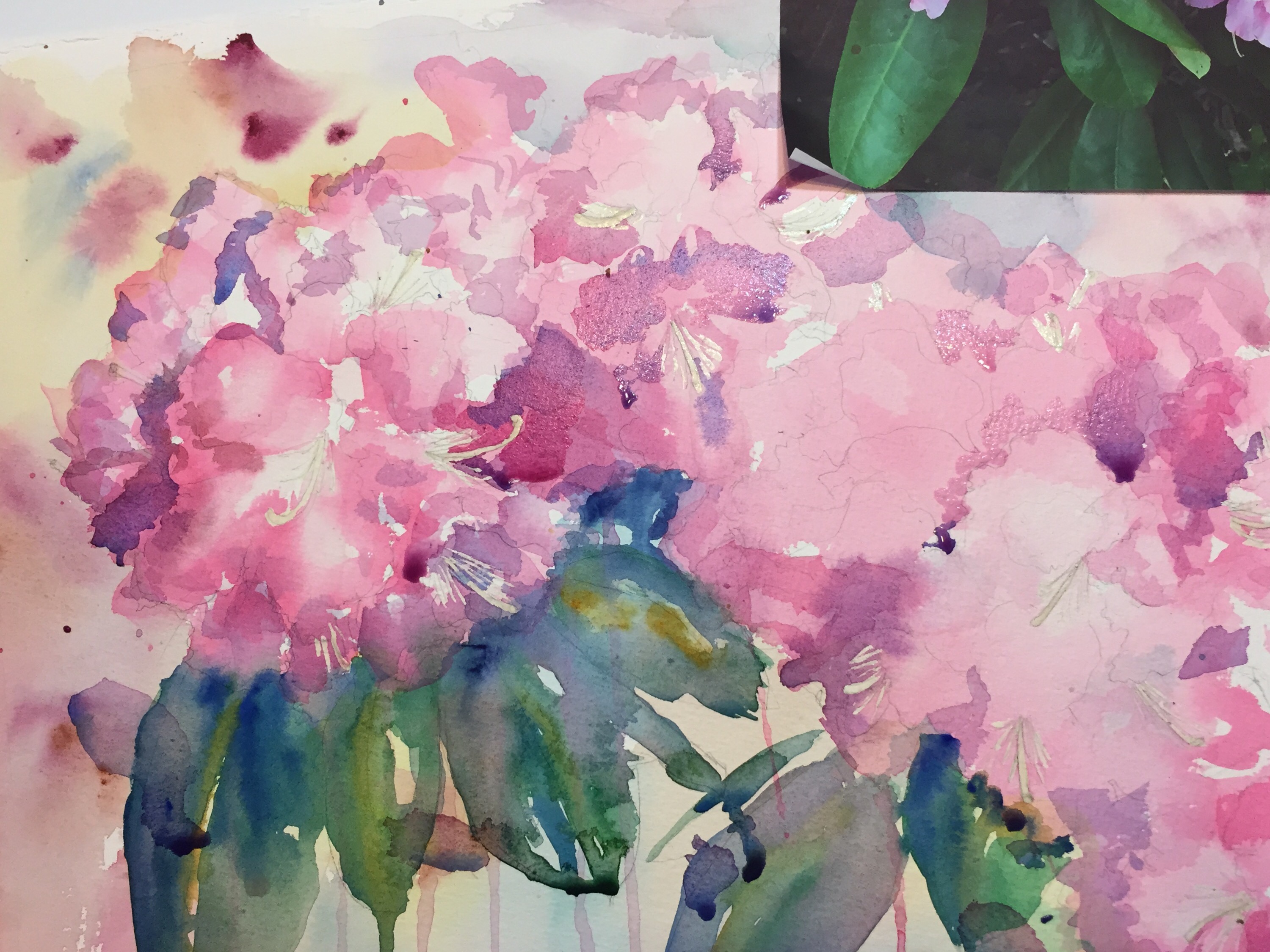 I started with a good drawing of the flowers. I still got lost painting them. All pink rhododendrons look the same.
