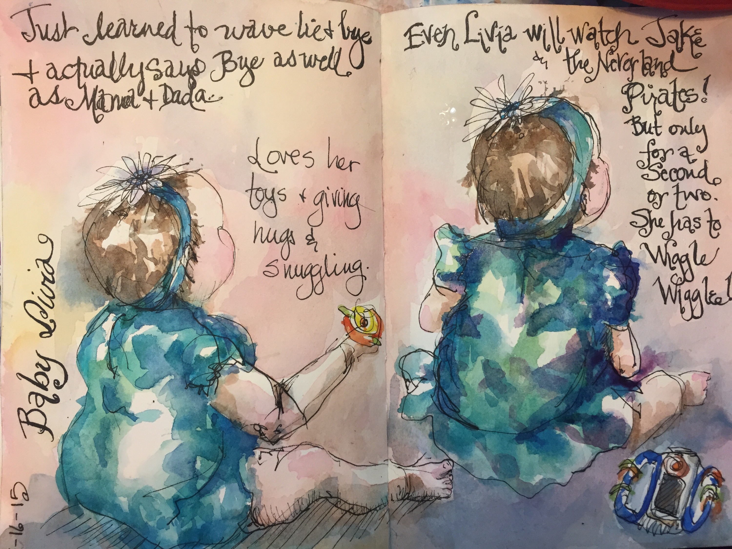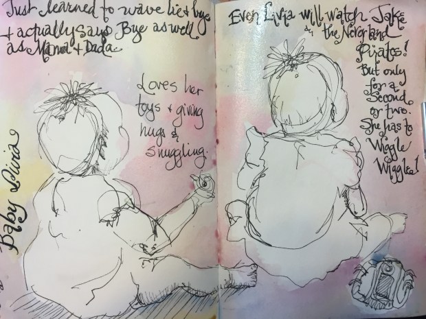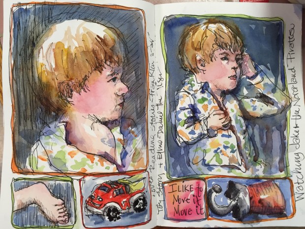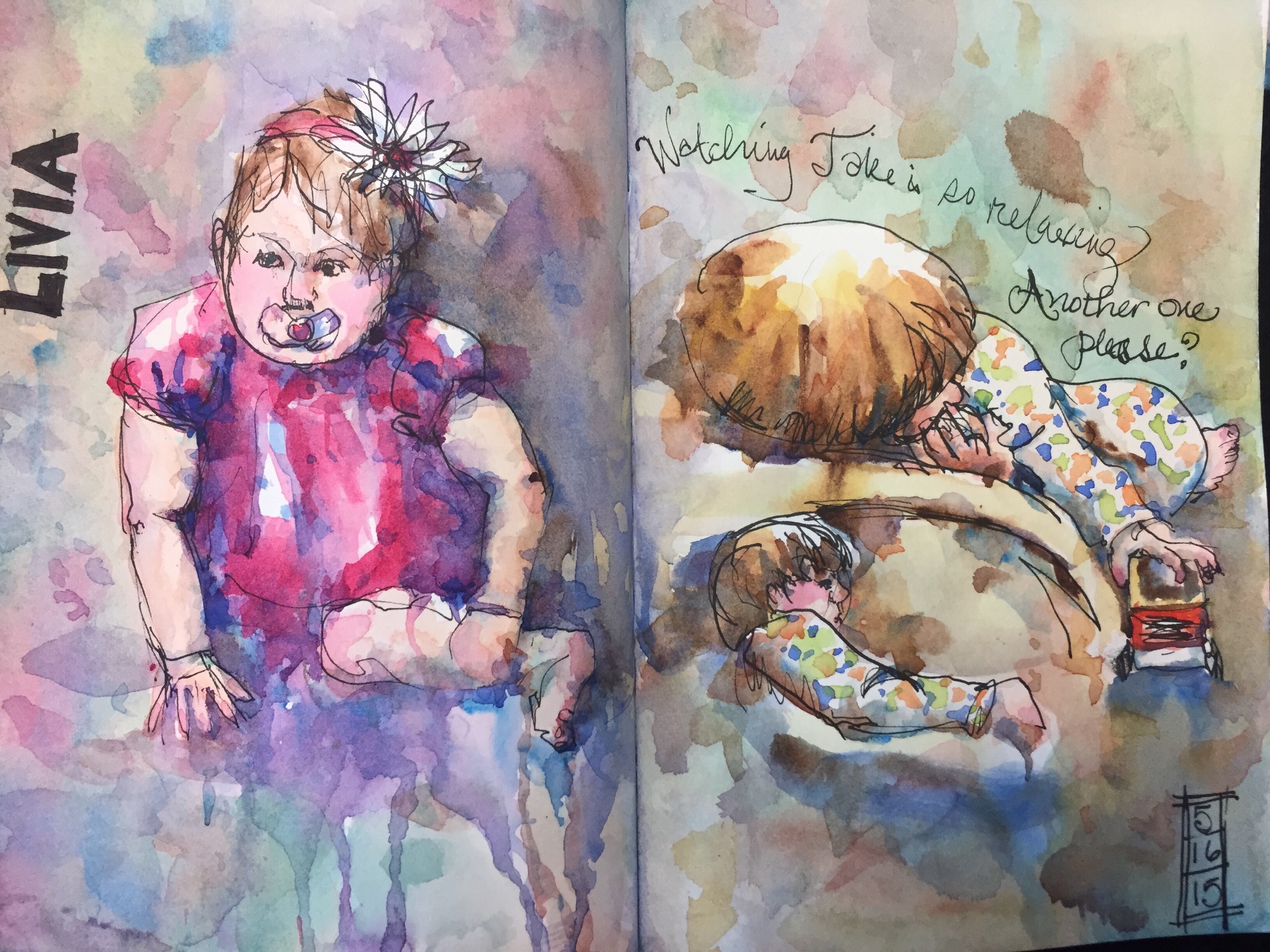 I actually like this odd assortment of people. Originally there were more tents planned in the background but I didn’t paint them because dark large leaks from from other pages in the book. The guy in the hat had green on his face from the leaks. 😳 Got out the flesh gouache to fix him but it was not to successful. It was a dark green. Sigh. No feet. Not sure why other than people were just whizzing by. I couldn’t ask them to stop. Lol.
