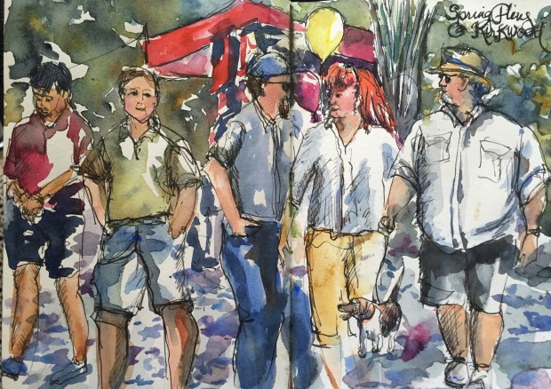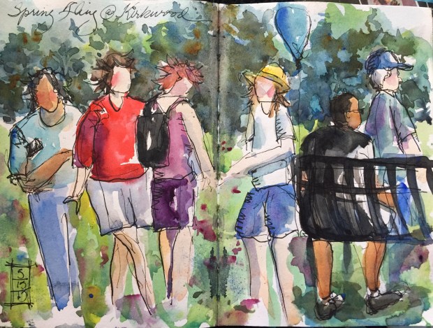 More random people at the Spring Fling. No idea why not one of these people have feet either other than they were moving so fast. They walked off before I could add their feet. Some of the people are compilations of several people walking by like the red head with the backpack in the middle. Drawing moving people is much easier to do with a brush pen. No drag on the surface like my Noodlers have when you draw with them.