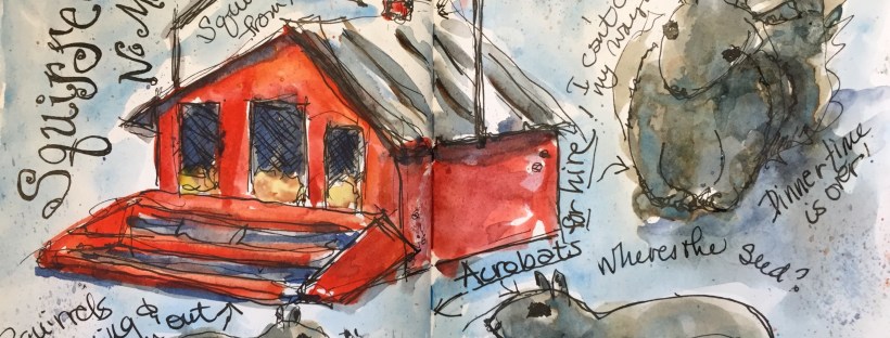 The squirrels are gluttons for bird seed gobbling voraciously. This bird feeder is actually squirrel proof. They are now entertaining us trying to figure out how to get into it. The top locks on and the bar across the front licks the seed up when the weight of the squirrels sets it. LOVE it. They don’t. They are actually hanging out on the porch rails staring at it with occasional attach forays and leave soon after. Very entertaining to watch their consternation over the shut off food supply. And of course they sit there staring making them easy subjects to draw.