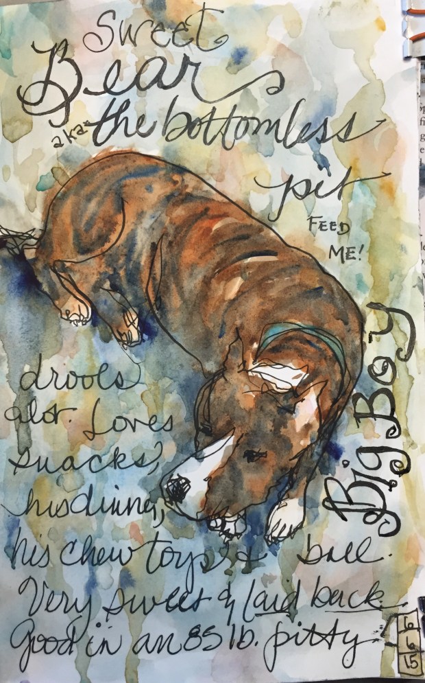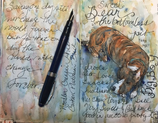 He’s a big brown brindled pitty that somebody dumped.  Wisely Bear attached himself to my son Ben two years ago and there he stays. He’s really a very laid back relaxed dog who would rather be petted than ever chew on you.  He was fun to journal about with my Noodler Creaper Ahab in Carbon Platinum Black ink.