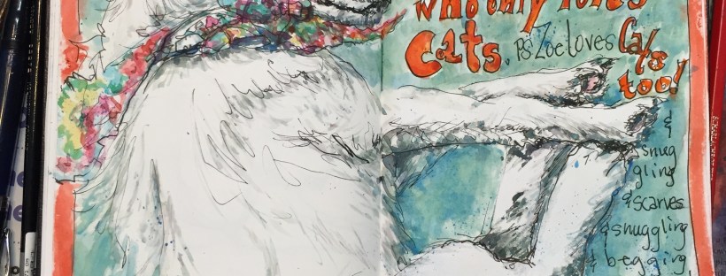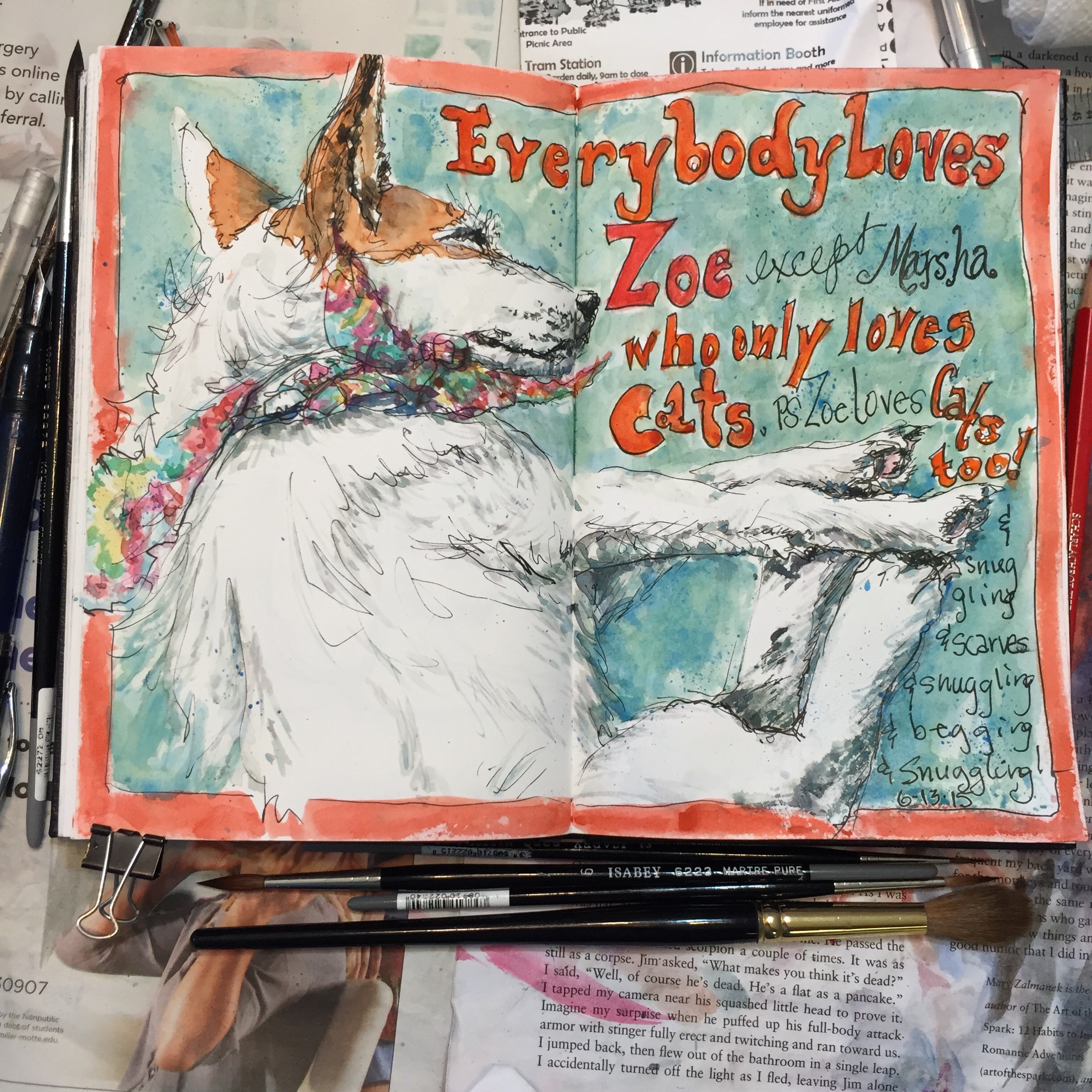 Zoe loves to snuggle. Drew this while we were watching CBS Sunday morning. Painted it while listening to Super Soul Sunday my two favorite shows. Noodler Creaper Ahab in my Stillman and Birn Alpha. Wish I had bought a zeta. The paper buckles a lot with washes but will flatten out somewhat when the book is closed. Also the paper does not let you live color without some pilling. No book is perfect but S&B tries hard.