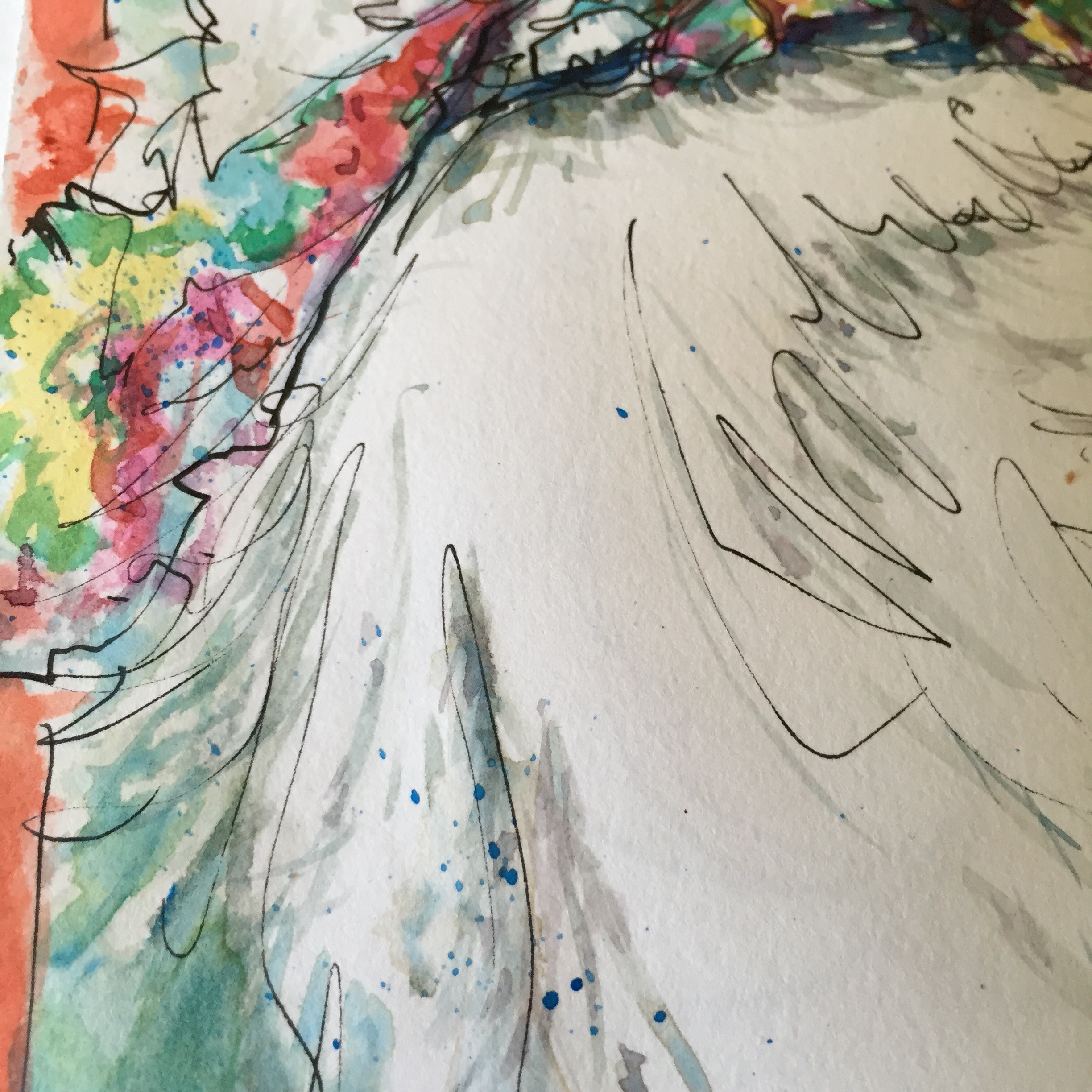 Noodler creaper Ahab Carbon Black ink. Greys – Cerulean and Quin Sienna on the blue side darker grey Quin Sienna and Inathridone blue. Red fur Quin Sienna and Burnt umber w touches of Inathradone blue. Letters and border Quin red and cad orange. Background cerulean and Aureolin yellow. Scarf. Hmm all the above colors and mineral purple. Splattered with cerulean.
