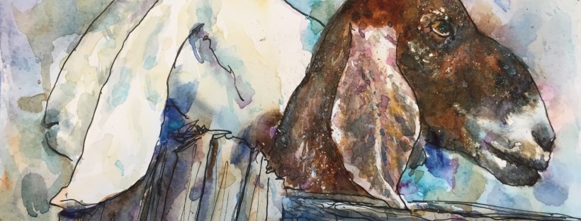 Back to the goats. The only thing I did different than usual was to splatter the left goat with white gouache using an old toothbrush. Why?! The goat is a kind of roan color peppered with white. Hard to Dow I th watercolor. I could have used masking fluid but this is just a sketch so I opted for splattering. More fun than masking fluid anyway.