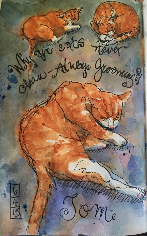 He’s a big brown brindled pitty that somebody dumped. Wisely Bear attached himself to my son Ben two years ago and there he stays. He’s really a very laid back relaxed dog who would rather be petted than ever chew on you. He was fun to journal about with my Noodler Creaper Ahab in Carbon Platinum Black ink.