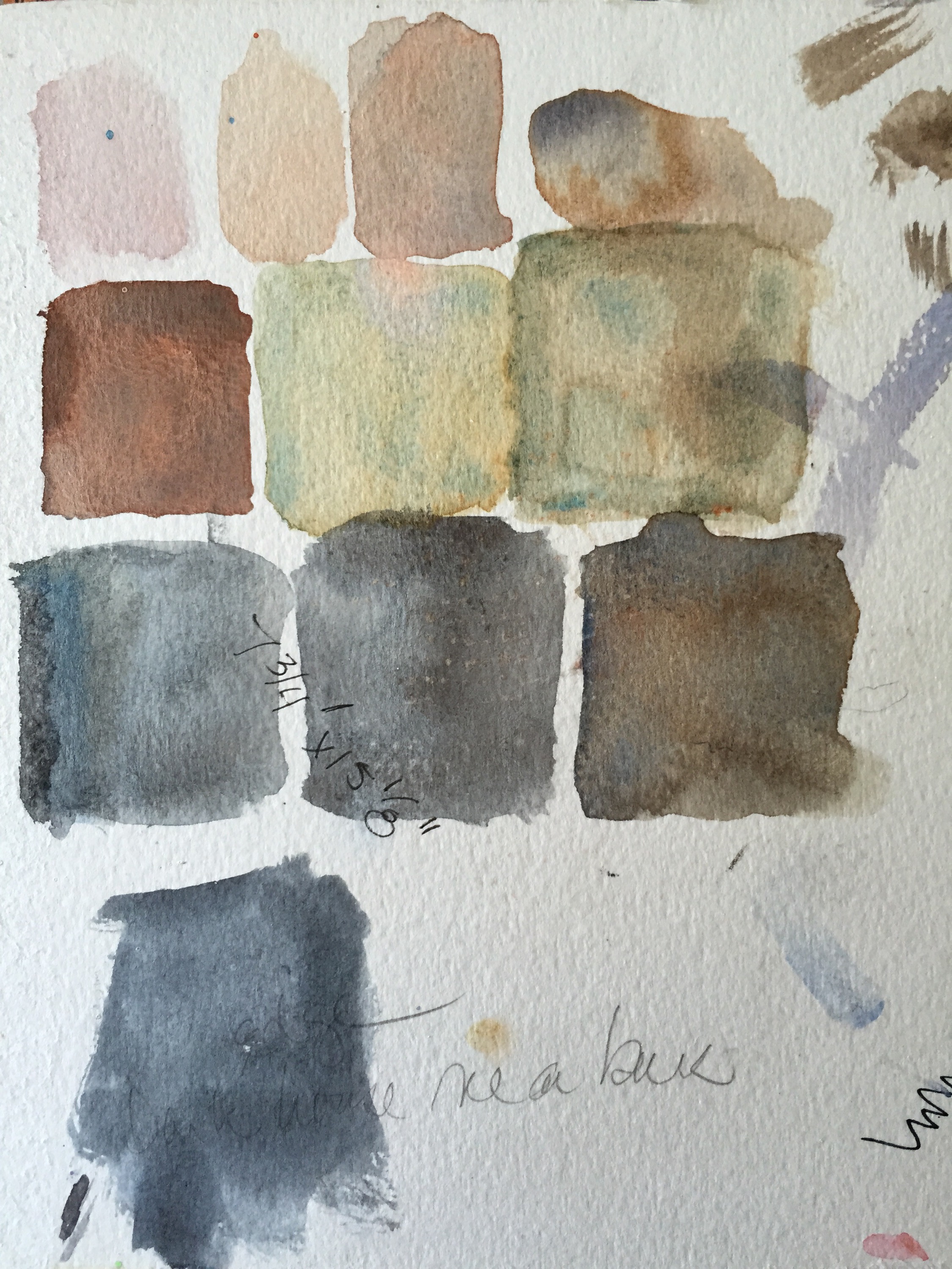 The background started as a dirty grey cerulean. I stood the sketch book at a 90 degree angle and let bits of Quin burnt sienna, yellow ochre, Inathridone blue for the drops and splats.