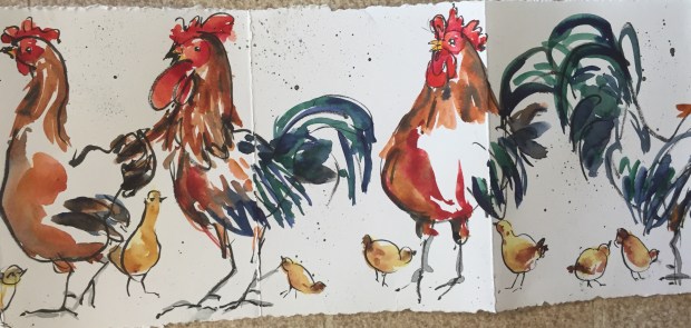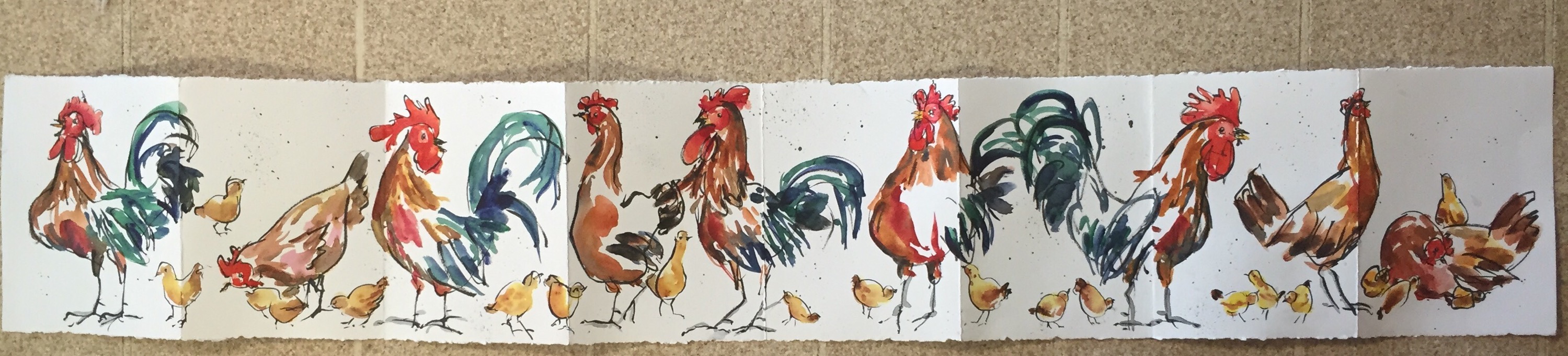 Chickens actually use the crosswalks to cross the busy streets. I saw them do it with my own two eyes. Truly they do. And I love following them around to draw them.
