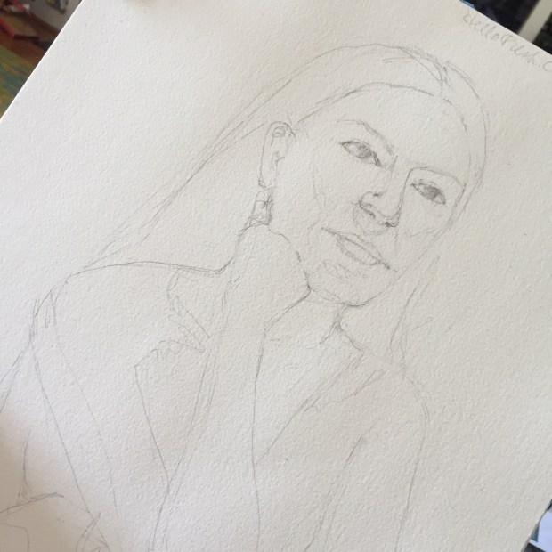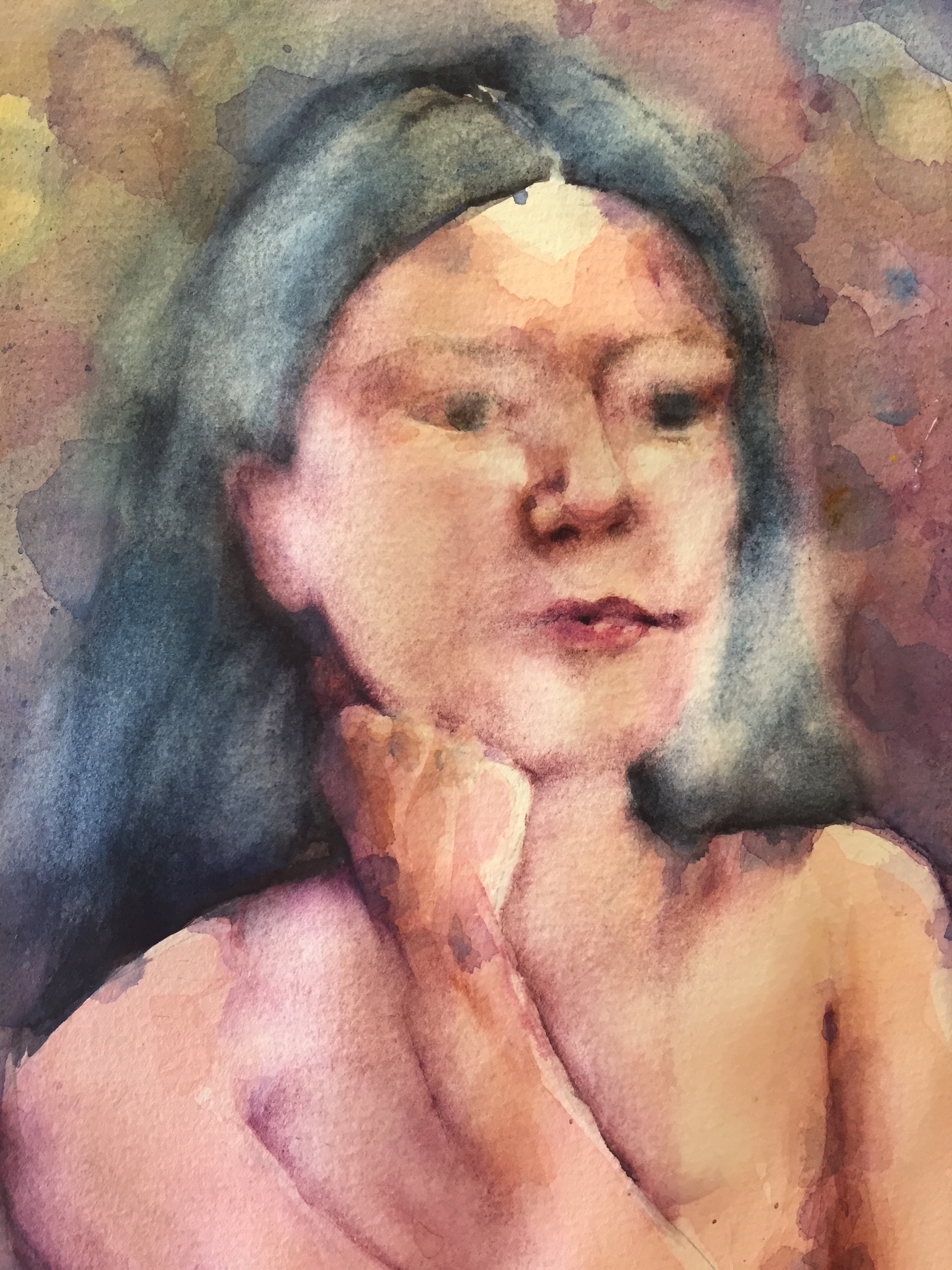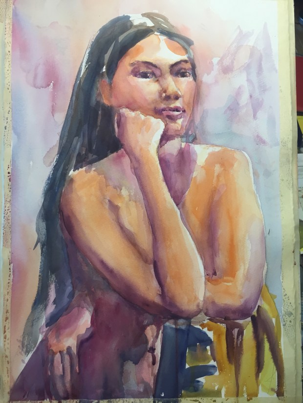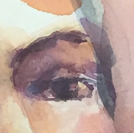 While watching Bloodlines last nite I realized I could improve this by lifting some of the too orange orange and widening the area to the right of her eye. So I got up this morning and started scrubbing off color. You can lift off kilimanjaro but the paper gets roughed up. Wish I had painted her on fabriano the paper that takes a scrubbing and keeps on going. It’s super. Oh well.