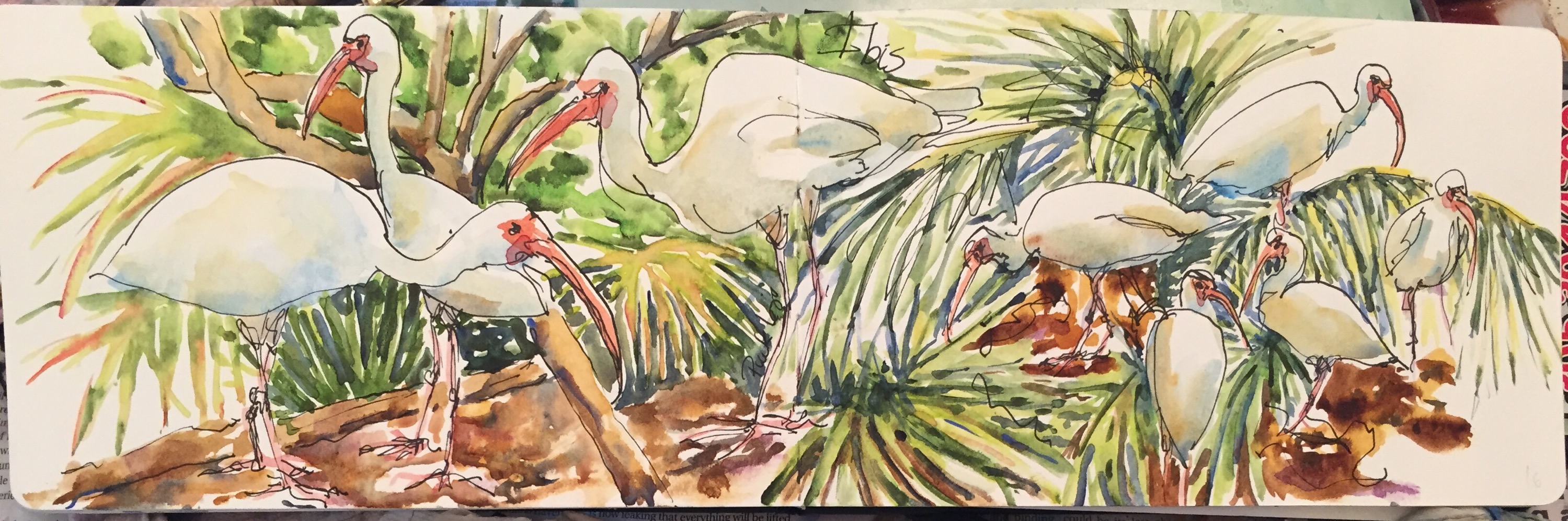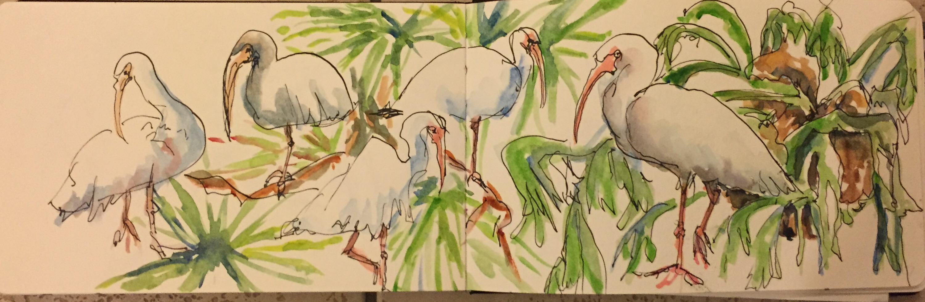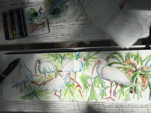 I did this one entirely on site sta picnic table there. Watch out for the bird poo lol. The ibises were great. They loved to pose. Some of the younger ones would let you get quite close. The younger ones have brown heads or totally brown bodies. The ibises are painted with cerulean and raw sienna for shadows. Beaks are painted with cad red light and Winsor yellow. Legs same with a little cobalt blue added.