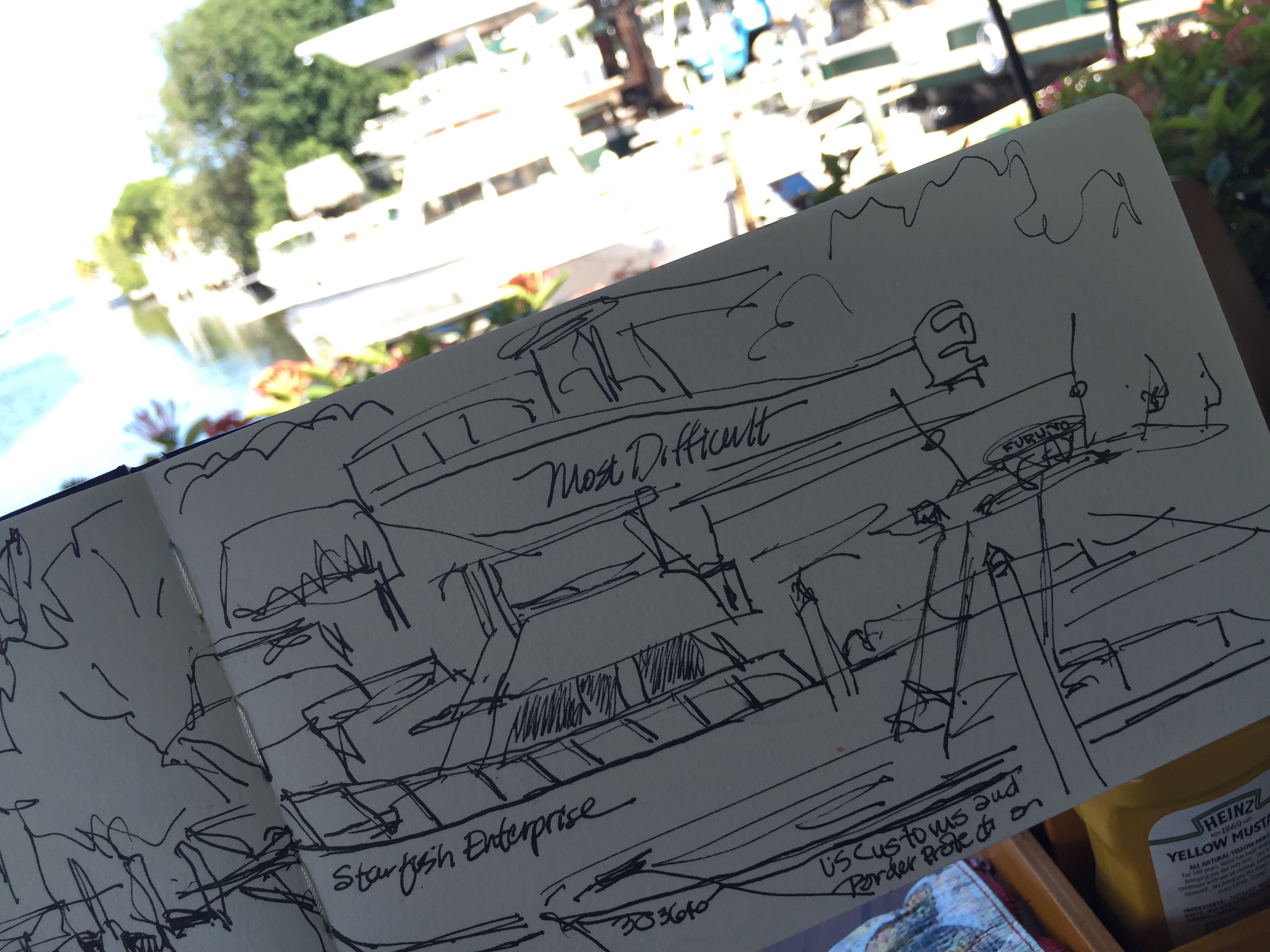 I also sketched the marine at Garden cove. This was our view from our table minus the bank of flowers across the edge.