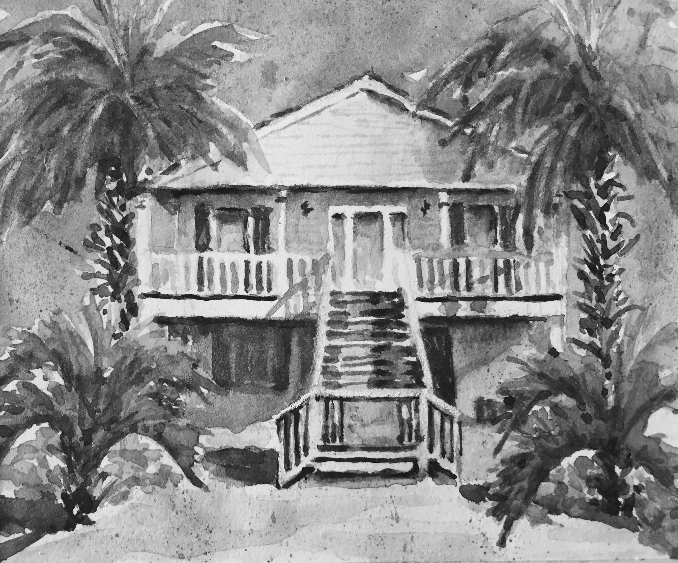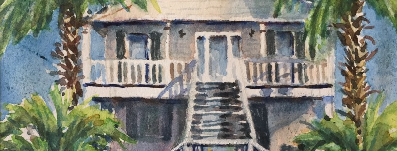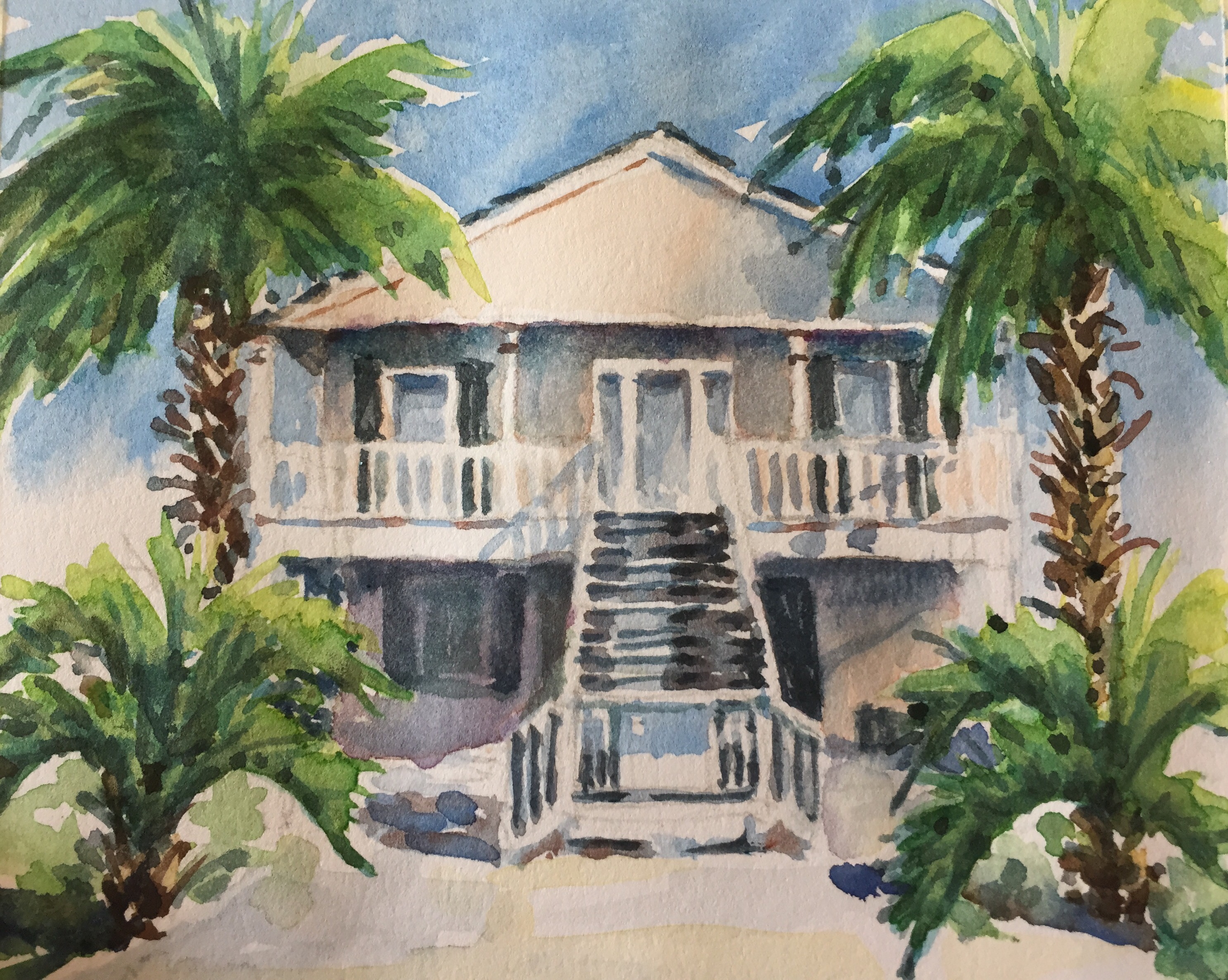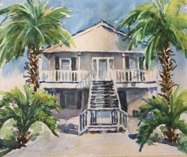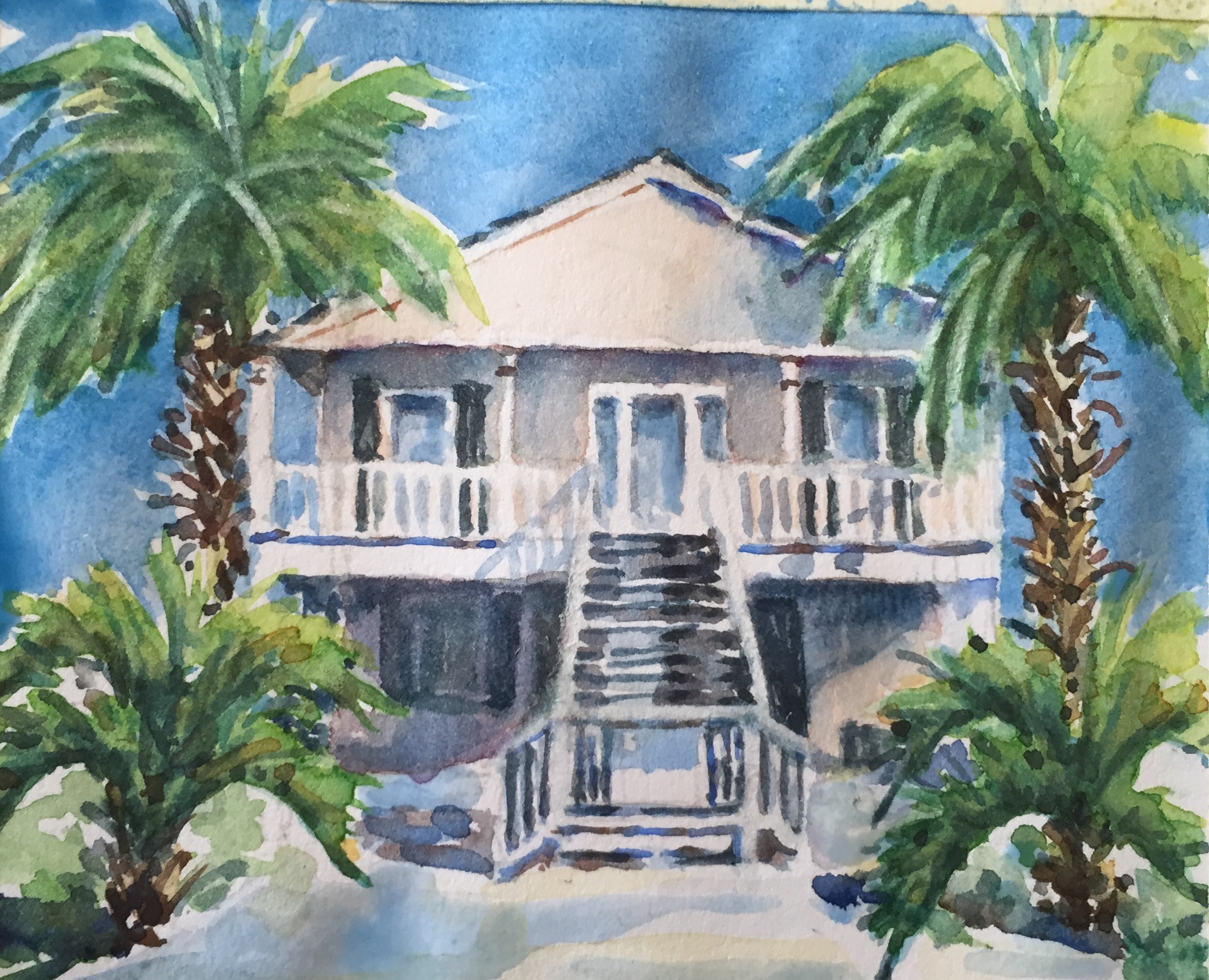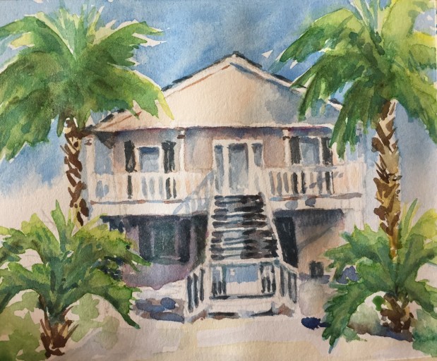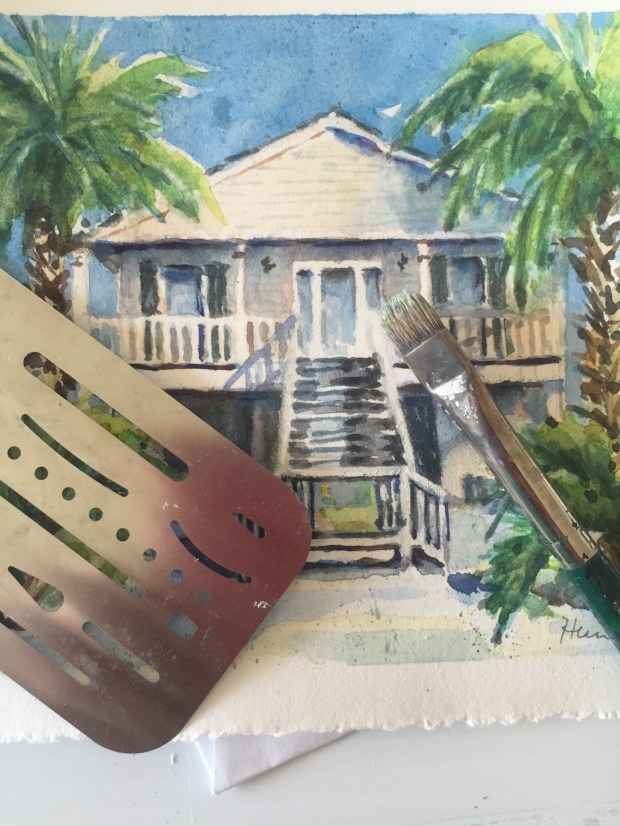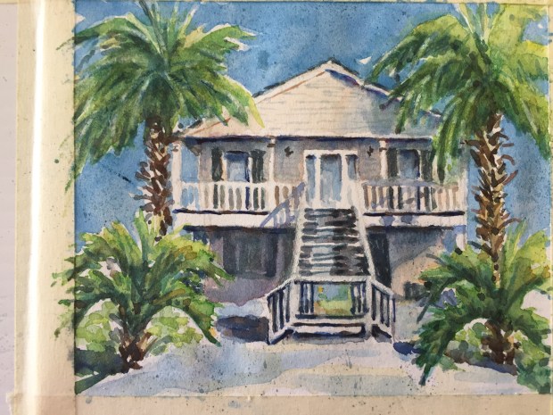 I added another wash of cerulean to darken the sky and make the very light house pop. Adding more darks under the porch roof and too all the rails and steps also made it pop more. Then I splattered it with Inathradone blue and burnt umber.