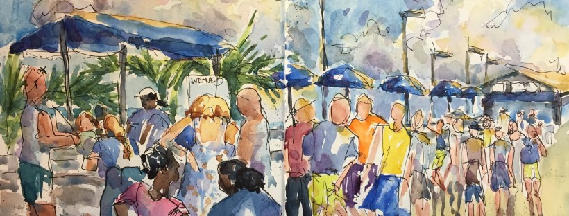 And of course you guessed that gold is Quin gold. The people’s shadows were made with a soupy Inathradone and burnt umber mix that I let drip from the feet by propping the sketch book up. I added burnt sienna to some of the figures to give them a tan. Tans are big at the beach.