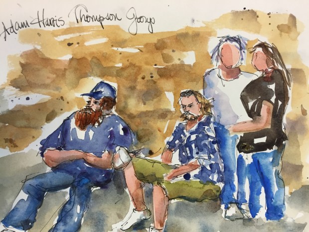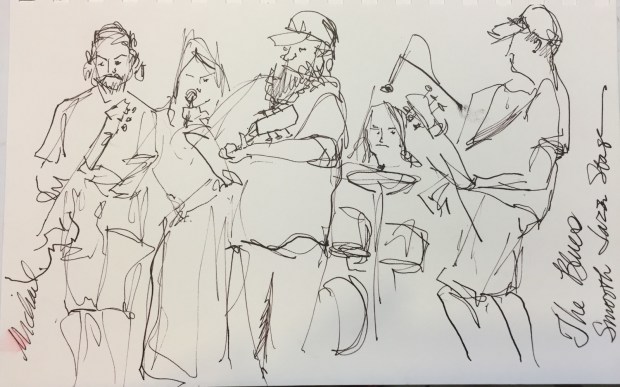 I actually drew the Adam Harris Thompson Group three times. This was the first time. There was an interesting group watching the act on stage which I had already drawn. I decided to draw them. Who knew it was the next group?!!