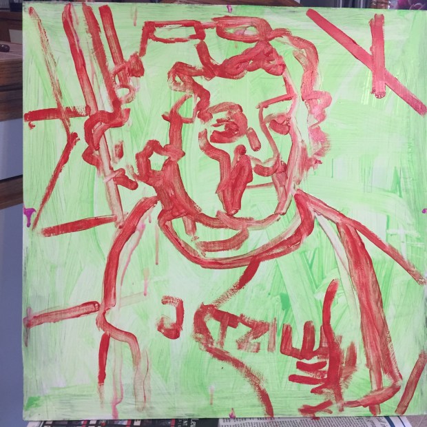 We started with a wash of background color on gessoed hardboard aka Masonite and then drew the portrait with a paint brush using  a complimentary color(red) to the green background.