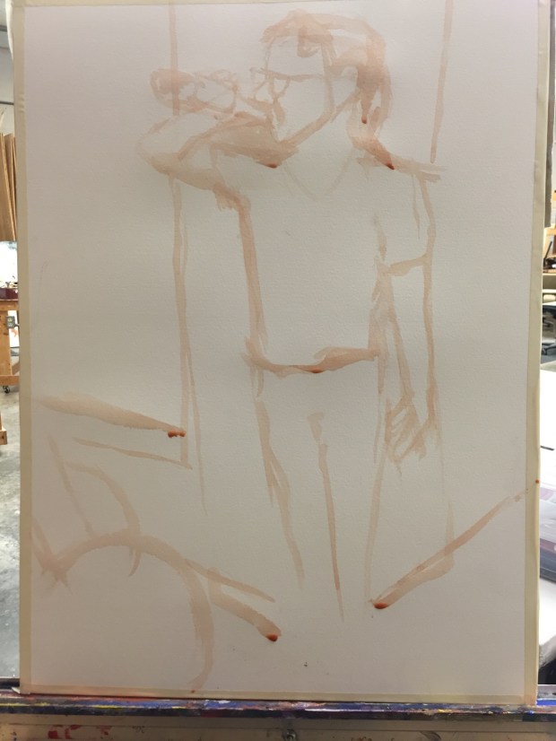 Here’s the sketch drawn with my paintbrush and a very watery burnt sienna. I hope I get the hang of this soon.  Maybe I just need to practice sketching with my paint brush. My size 4 Isabey.