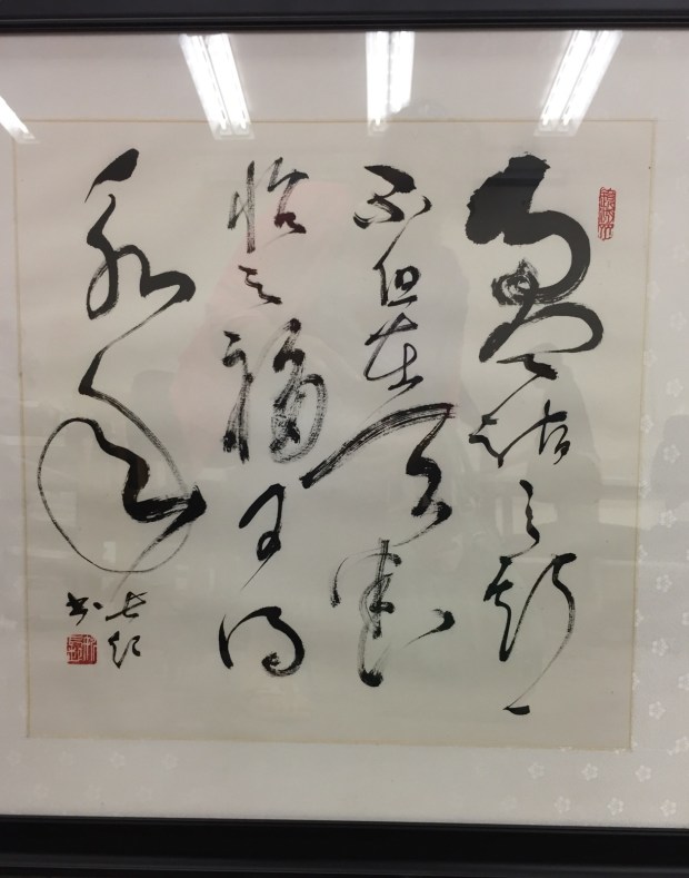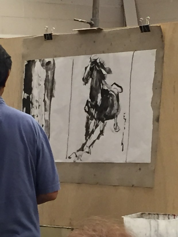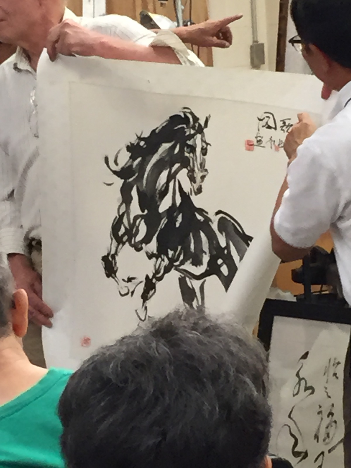 Thru an interpreter he explained that he ponders his subject for a few days and then paints it quickly with a large chinese ink brush and ink on rice paper which he ripped off a large roll.