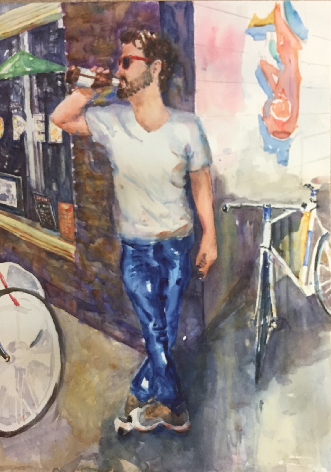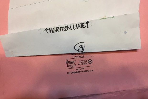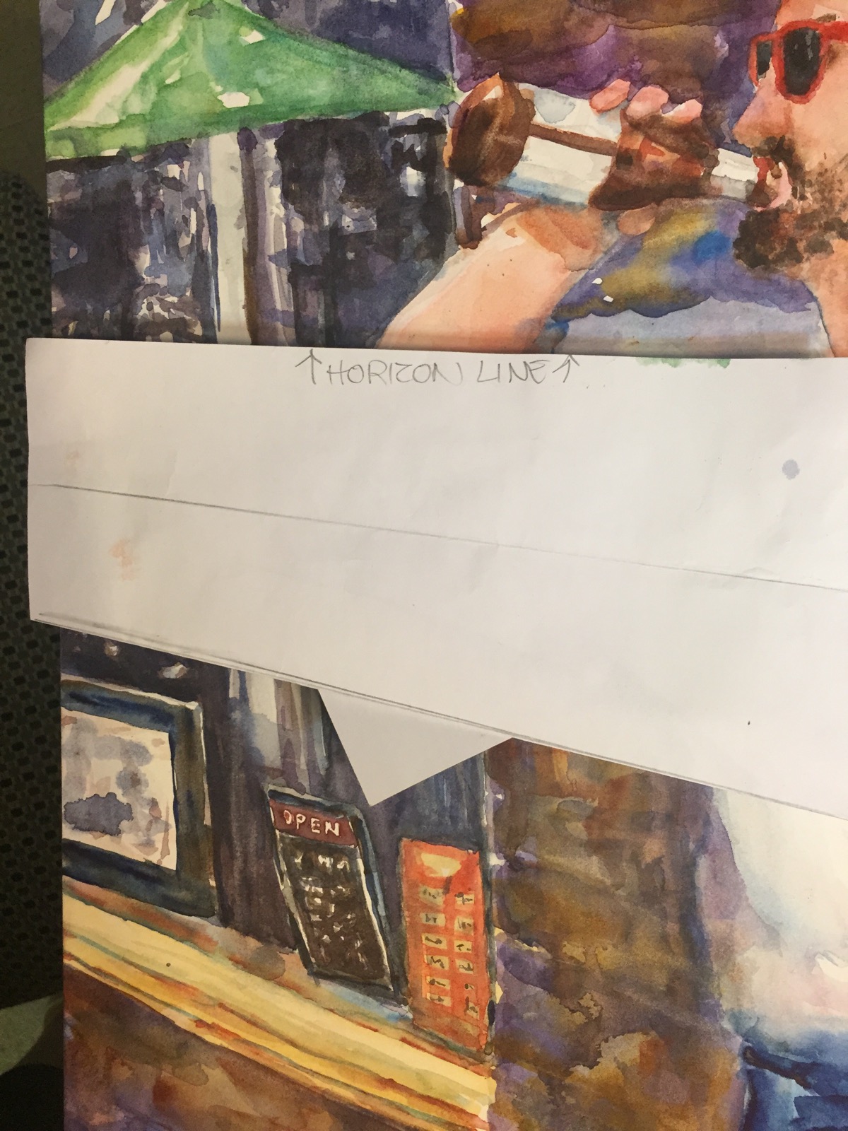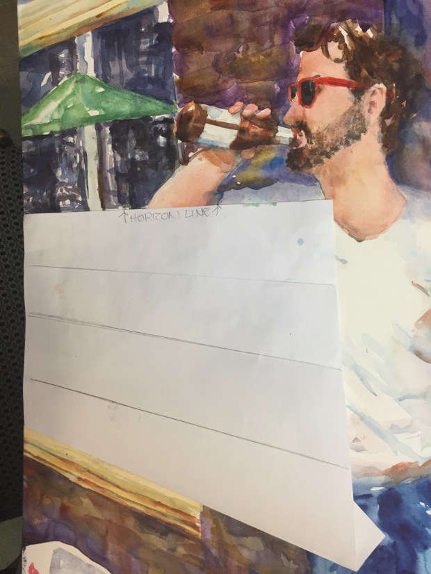 What you end up with looks like this. The lines were drawn with a brown watercolor pencil. The horizon line comes off of his shoulder.