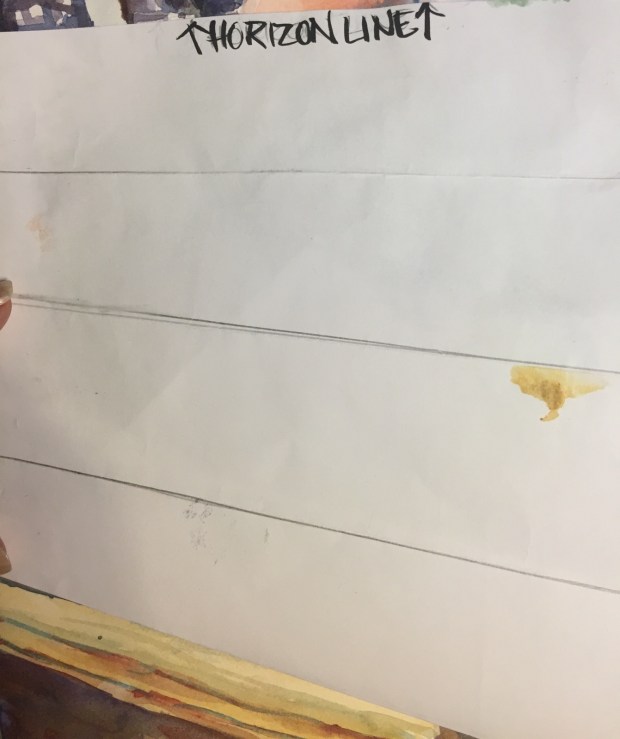 Ideally before you paint match the horizon line on your folded paper with the horizon line on the painting draw along the folds with a watercolor pencil to transfer the lines to your painting.