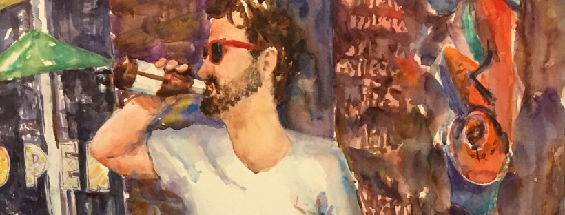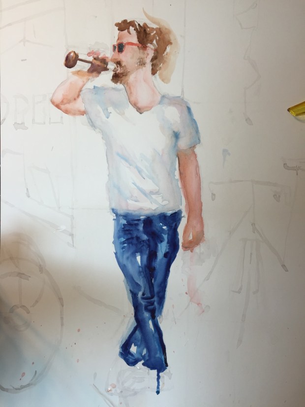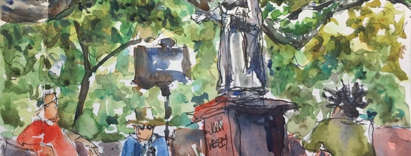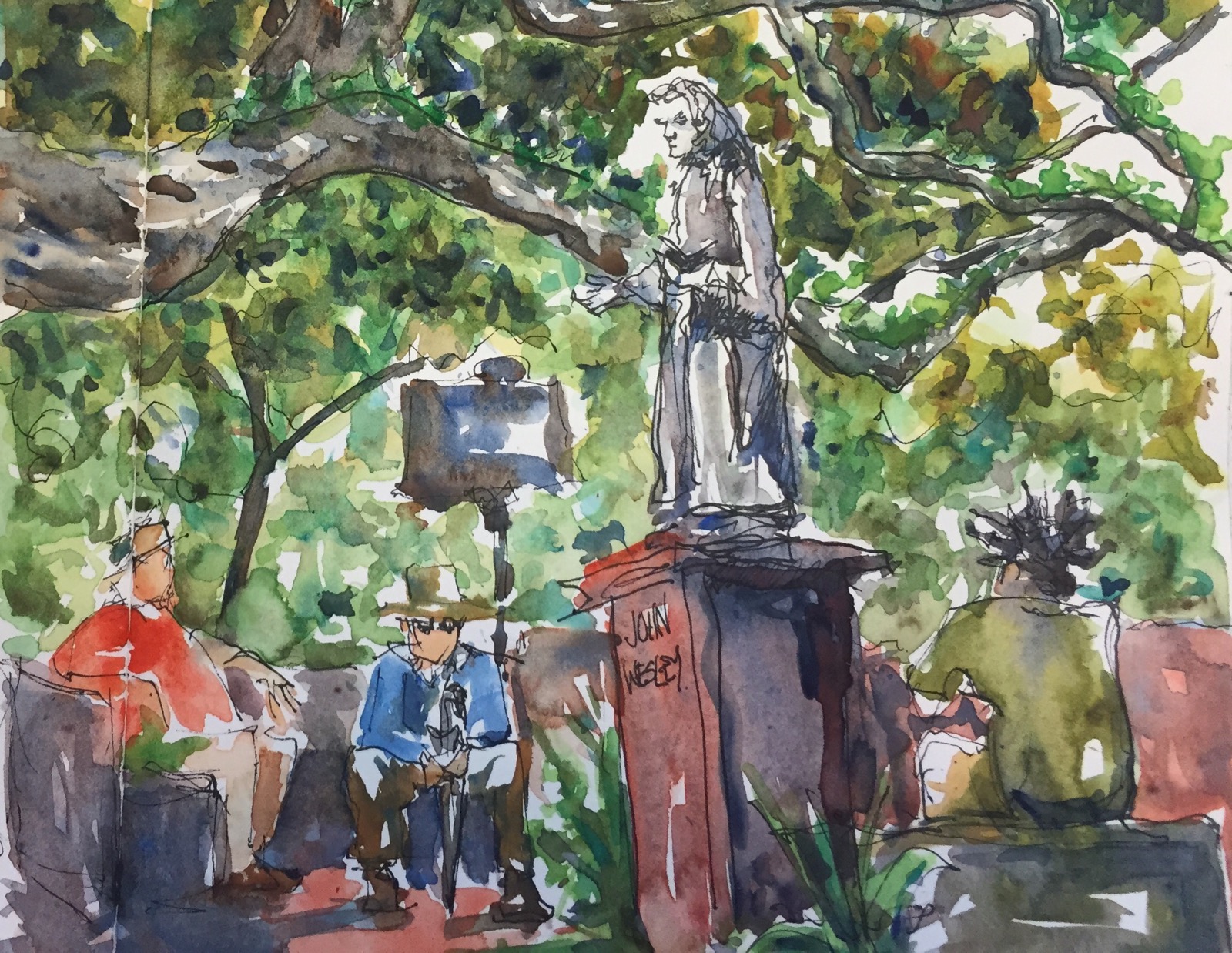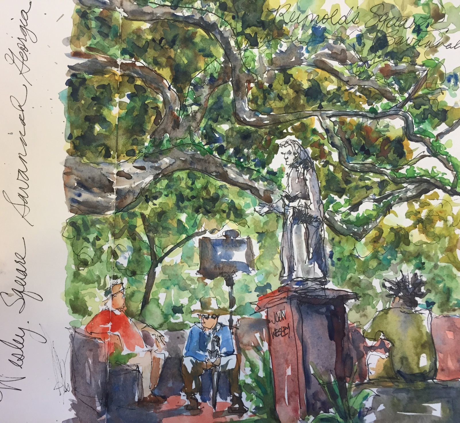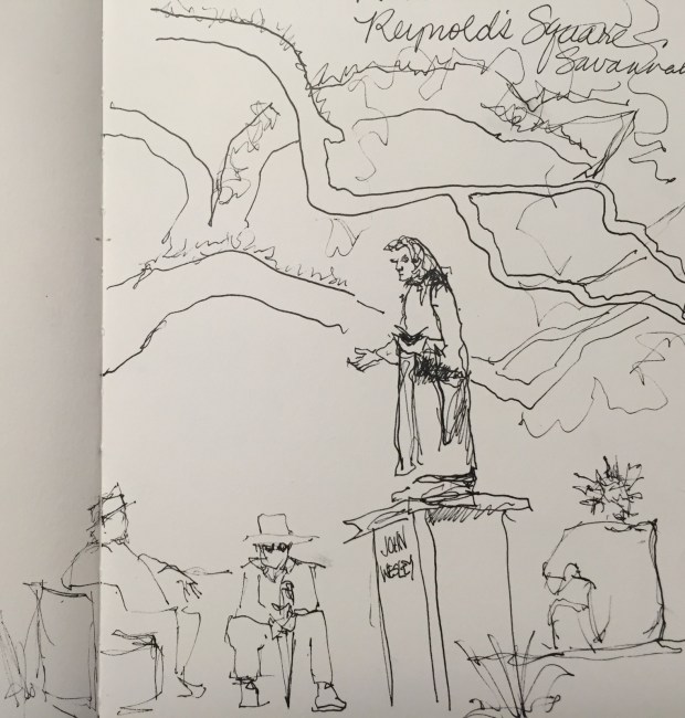 Originally I posted this picture but today I realized it wasn’t terrible it just needed a good crop. I wanted to make it about the live oak tree and the resurrection ferns on the sinuous boughs but it was really about the statute and the guys sitting in Wesley Square. I especially liked the guy on the right with the dreadlocks but all the guys turned out so well in the sketch.