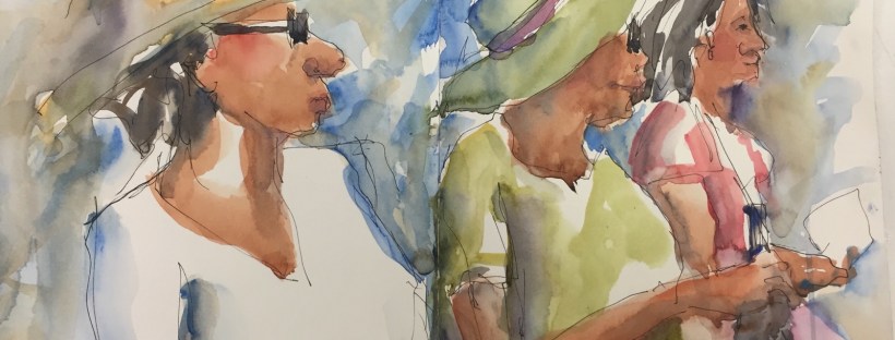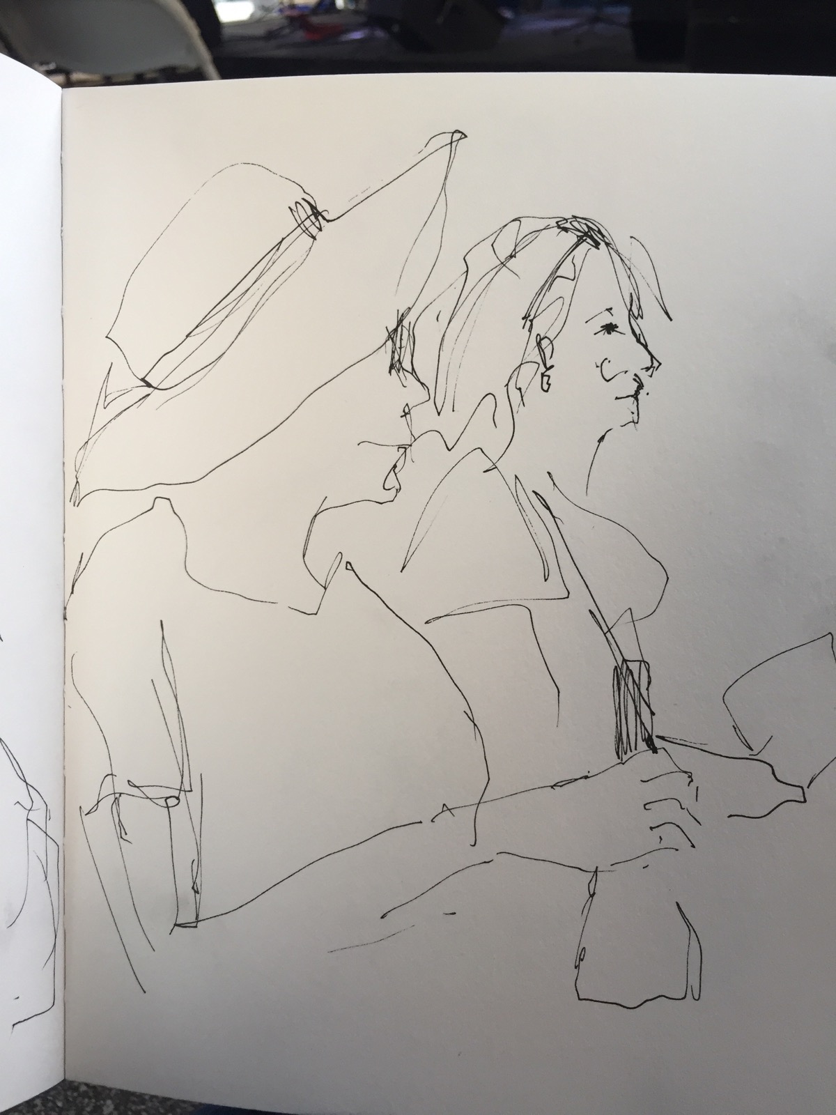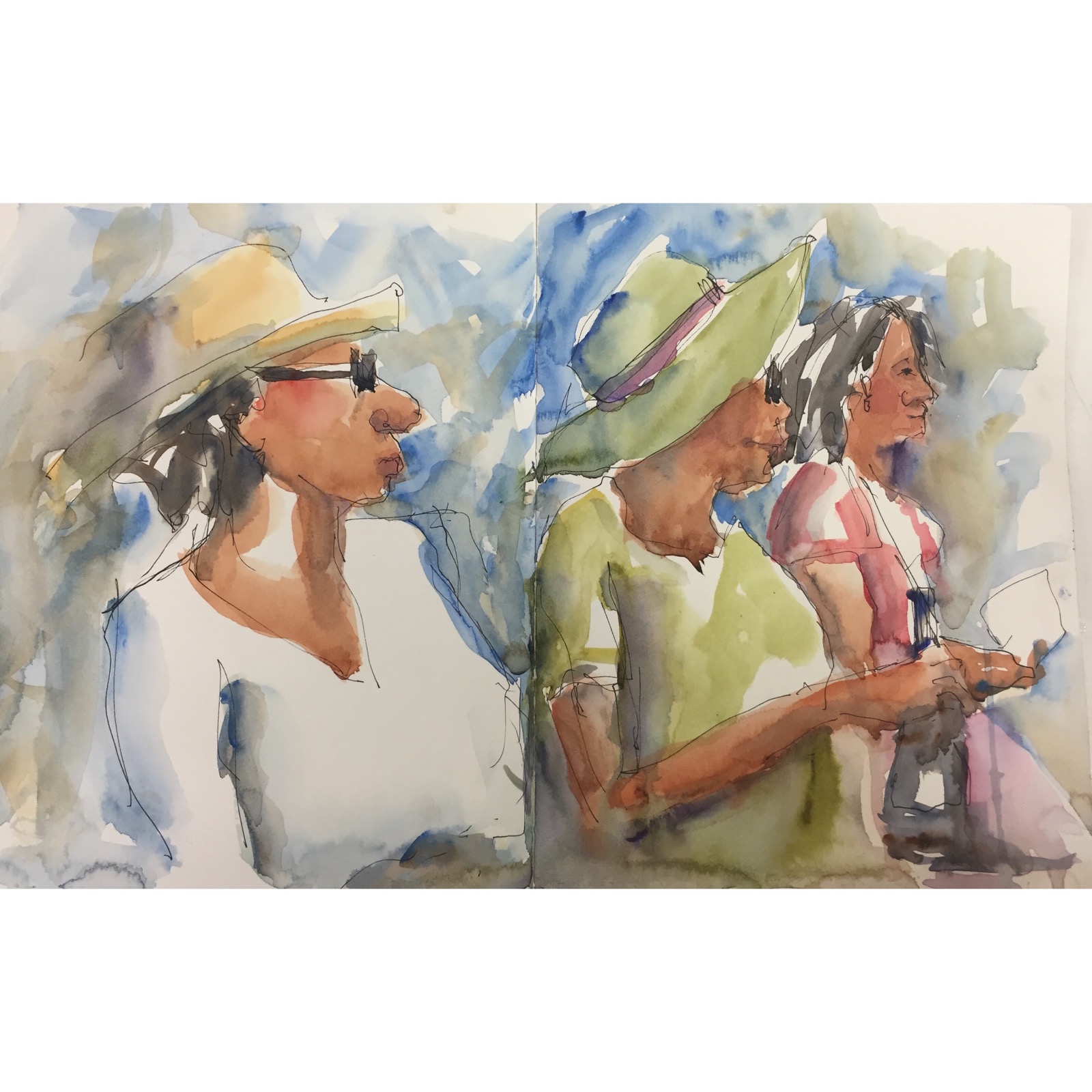My friend Ruth and I went sketching at the eighth street stage during arts in the hearts. These ladies were sitting in a nearby row like peas in a pod and I could not resist sketching them. Less than five feet from me.
