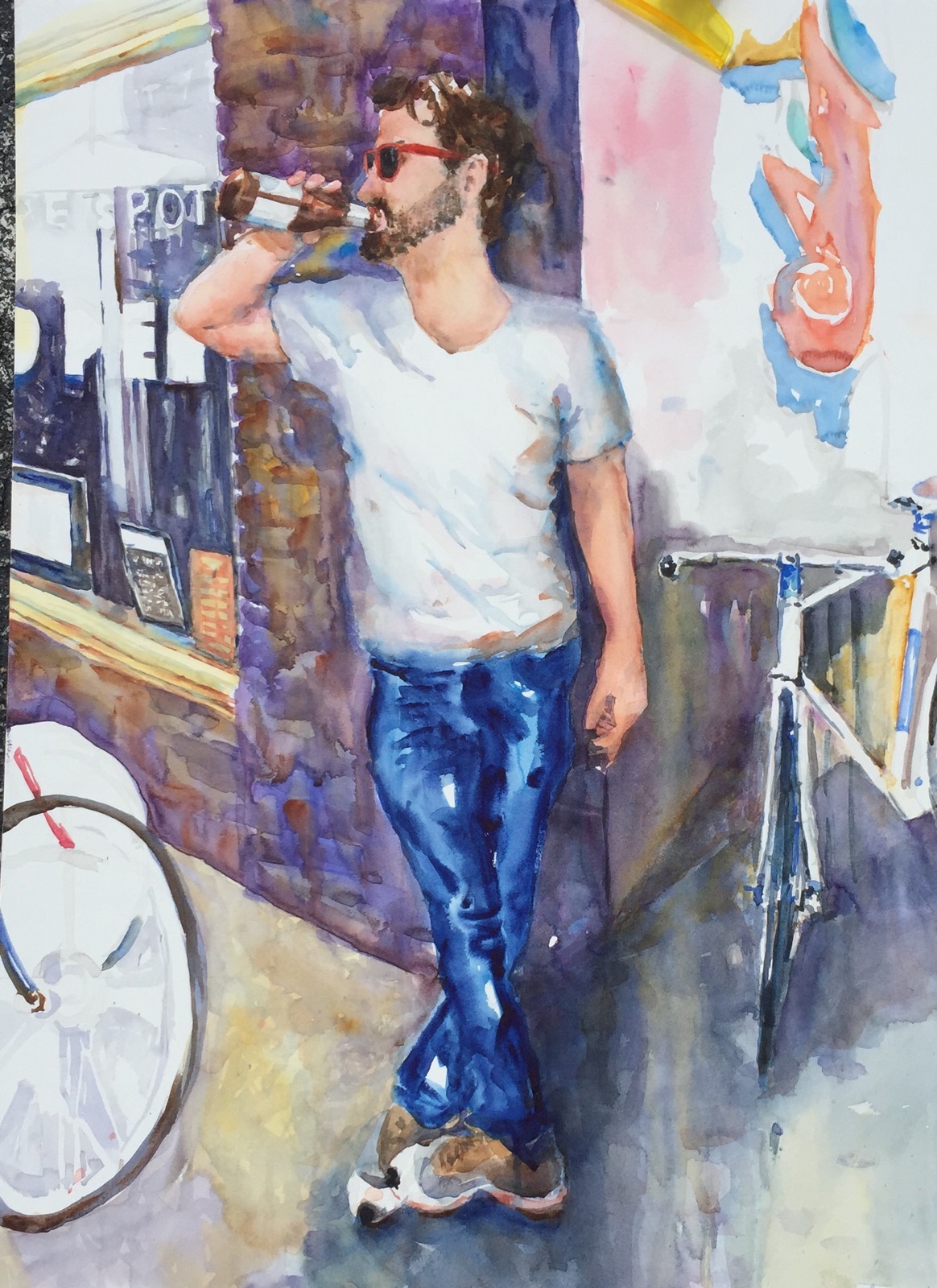 What you end up with looks like this. The lines were drawn with a brown watercolor pencil. The horizon line comes off of his shoulder.