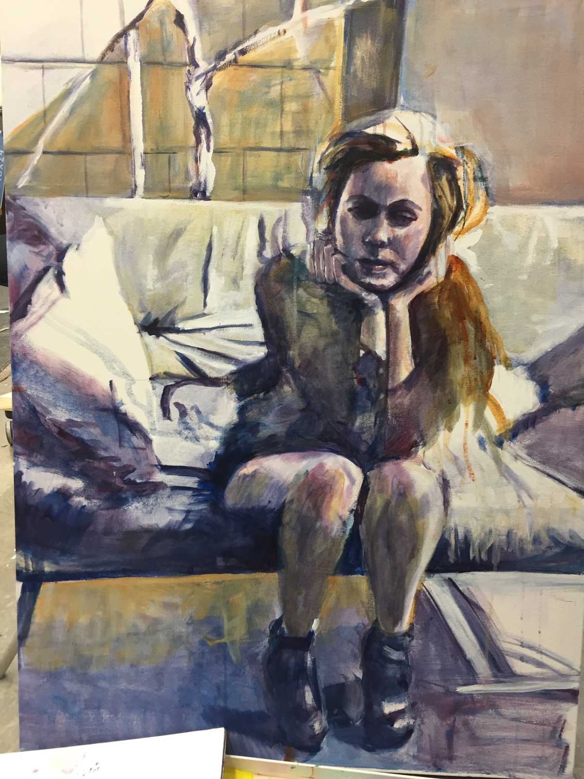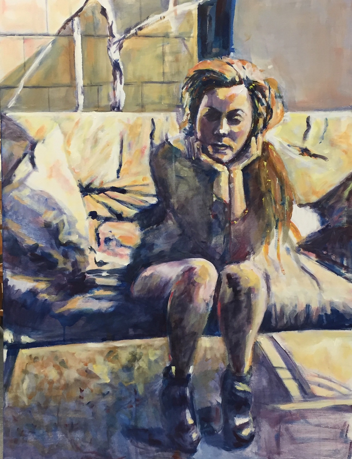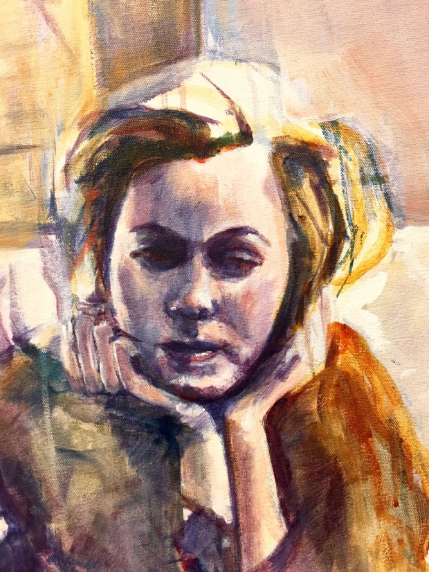 I drew her head first..then marked the seven heads noting where each head length ended. I also dropped imaginary plumb lines off of her chin to see where her body lined up…also horizontal lines to check on her arms..I had one elbow much too low for a while….I also checked the negative spaces between the arms and how the one leg hit the chair, where the chair seat lined up with the right leg.