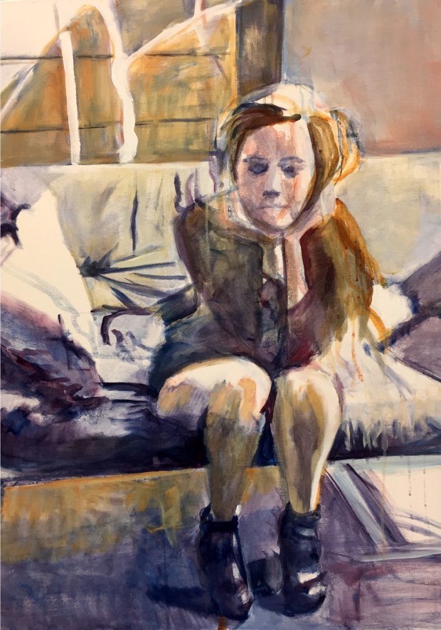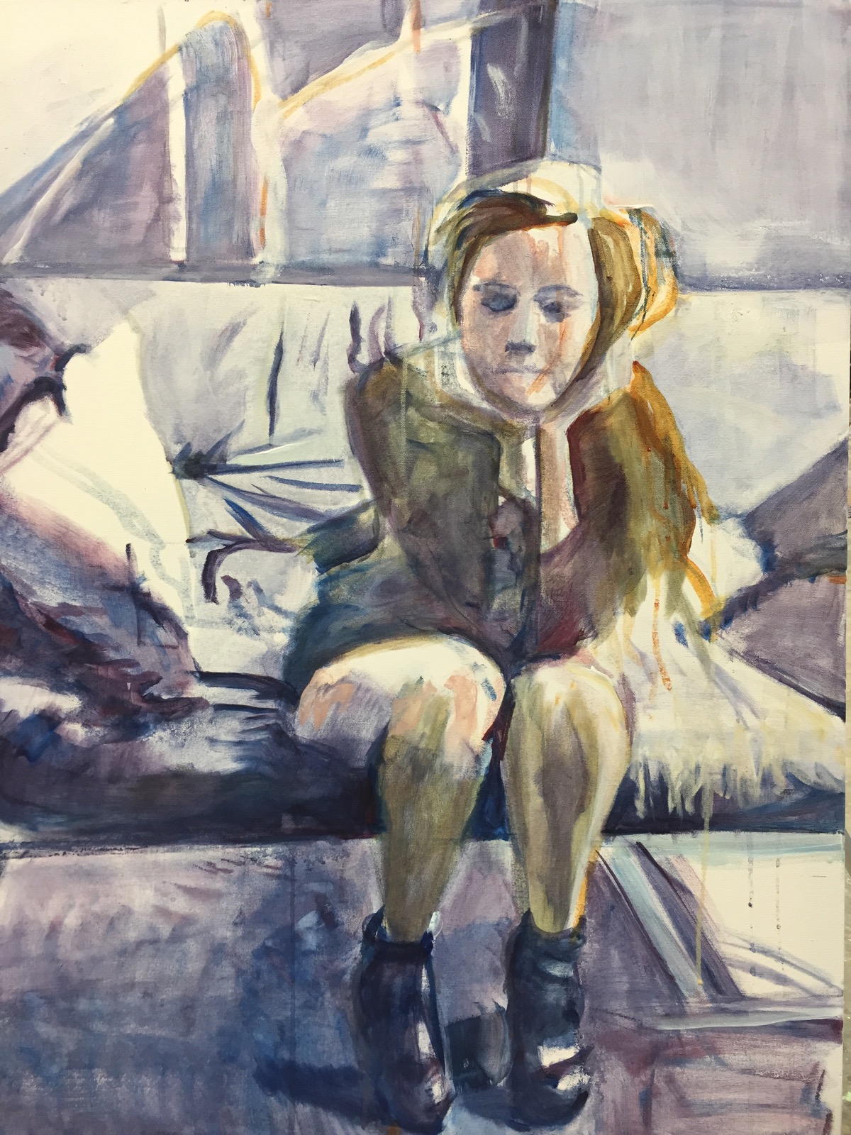Next thin layers of color are painted in. I was having a hard time with of all things CONTRAST. duh. I was using Phtalo Blue and Alzarin Crimson and not much else. A little flesh on the face.