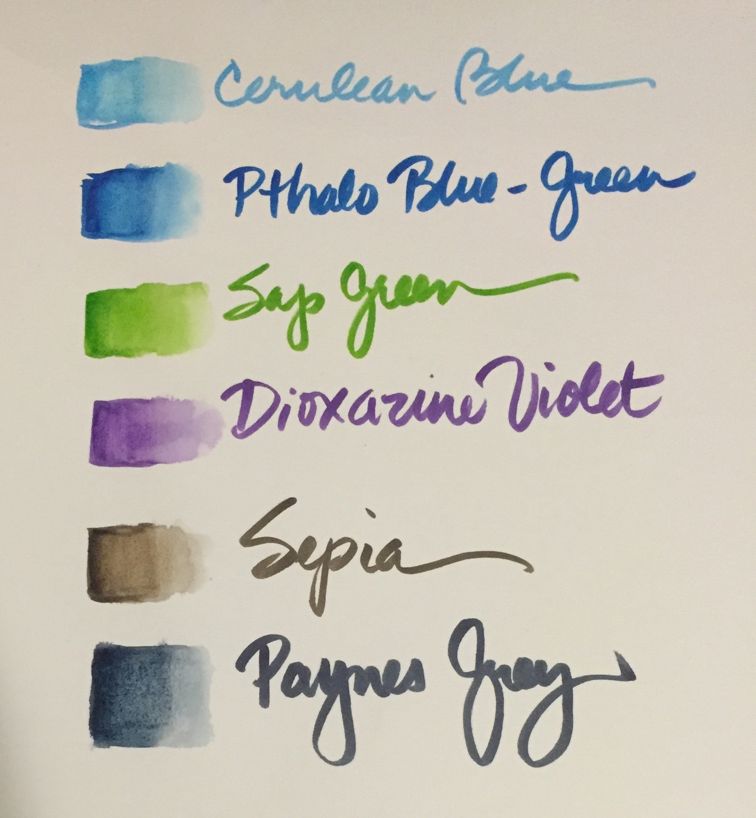 Another thing that I like about them is that the color can be dry and you can go back and blend it out later. When I did these samples I first drew all the squares then I wrote all the names and THEN I added water to show the range of the colors.