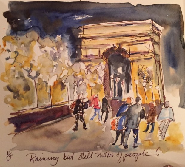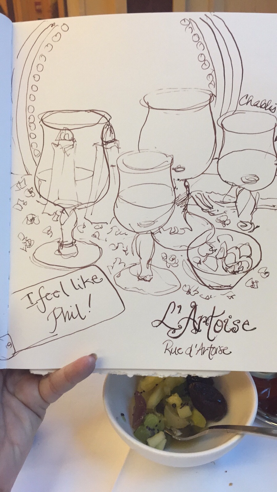 We ate dinner at L’Artois around the corner from our Hotel on Rue d’Artois. A sweet little place with the nicest owners. A nice way to dip our toes into Paris dining. This will get watercolor soon but not tonight after another six mile jaunt thru the drizzly beautiful Parisian streets.
