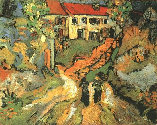Auvers remains much as it was when Van Gogh painted it and died there in 1890. The on.y changes in the lane behind he Inn he lived in are tourists and cars.  It is part of a preserved section of French countryside so it can’t be changed. If the trees were trimmed back you could see the house in the painting.  We climbed the stairs which are quite step to the lane above.