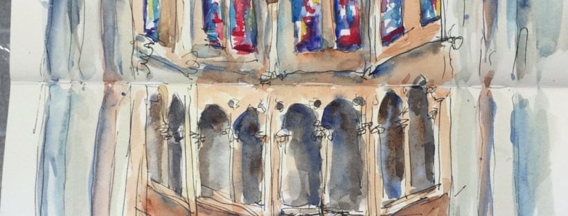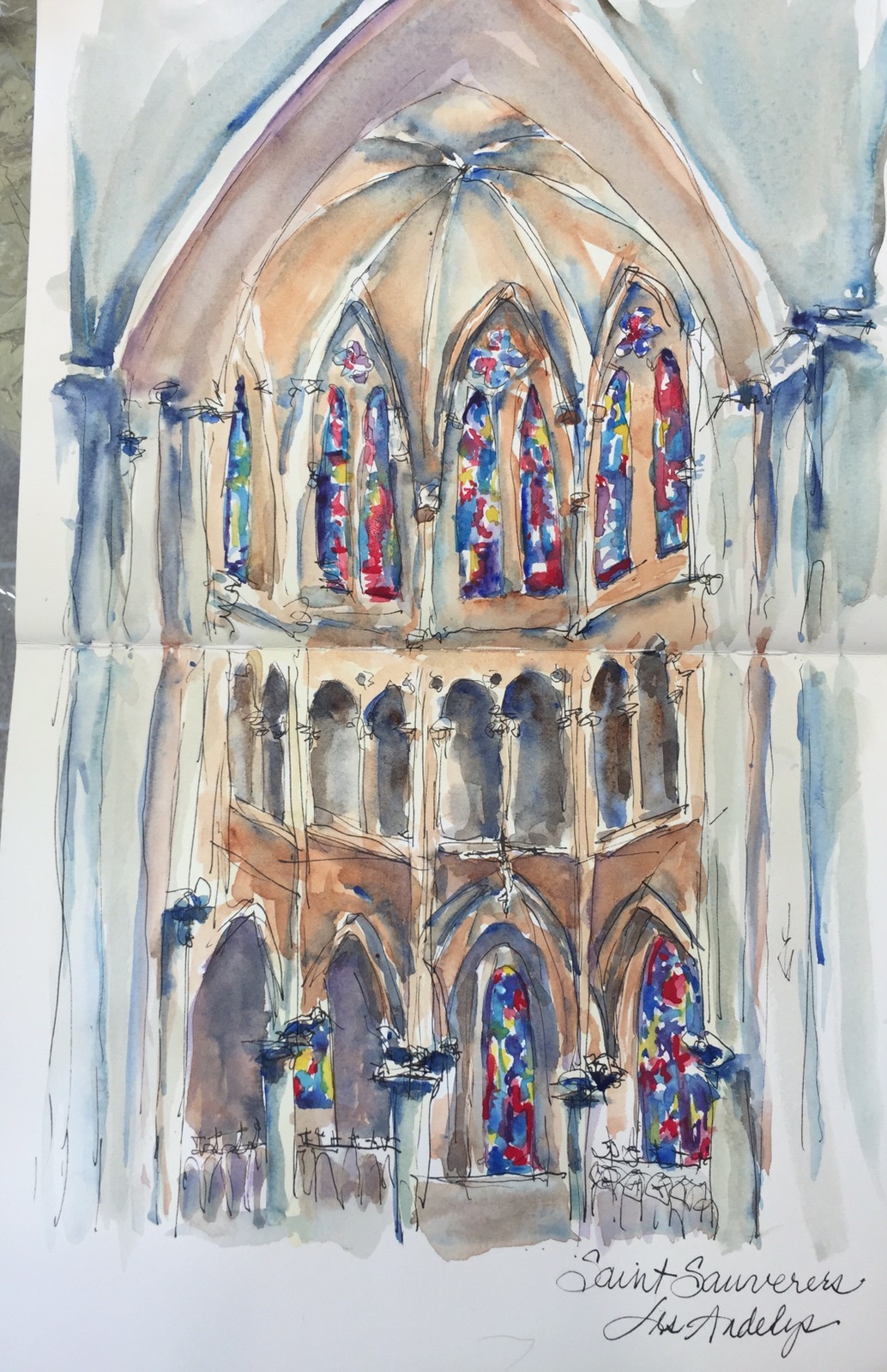 A quick sketch drawn while sitting in the lovely early morning quiet of the church. Not that Les Andelys is a hub bub of noise and activity!! It was lovely to sit in the still in the old rush seated chairs and admire the 16th century stained glass windows.